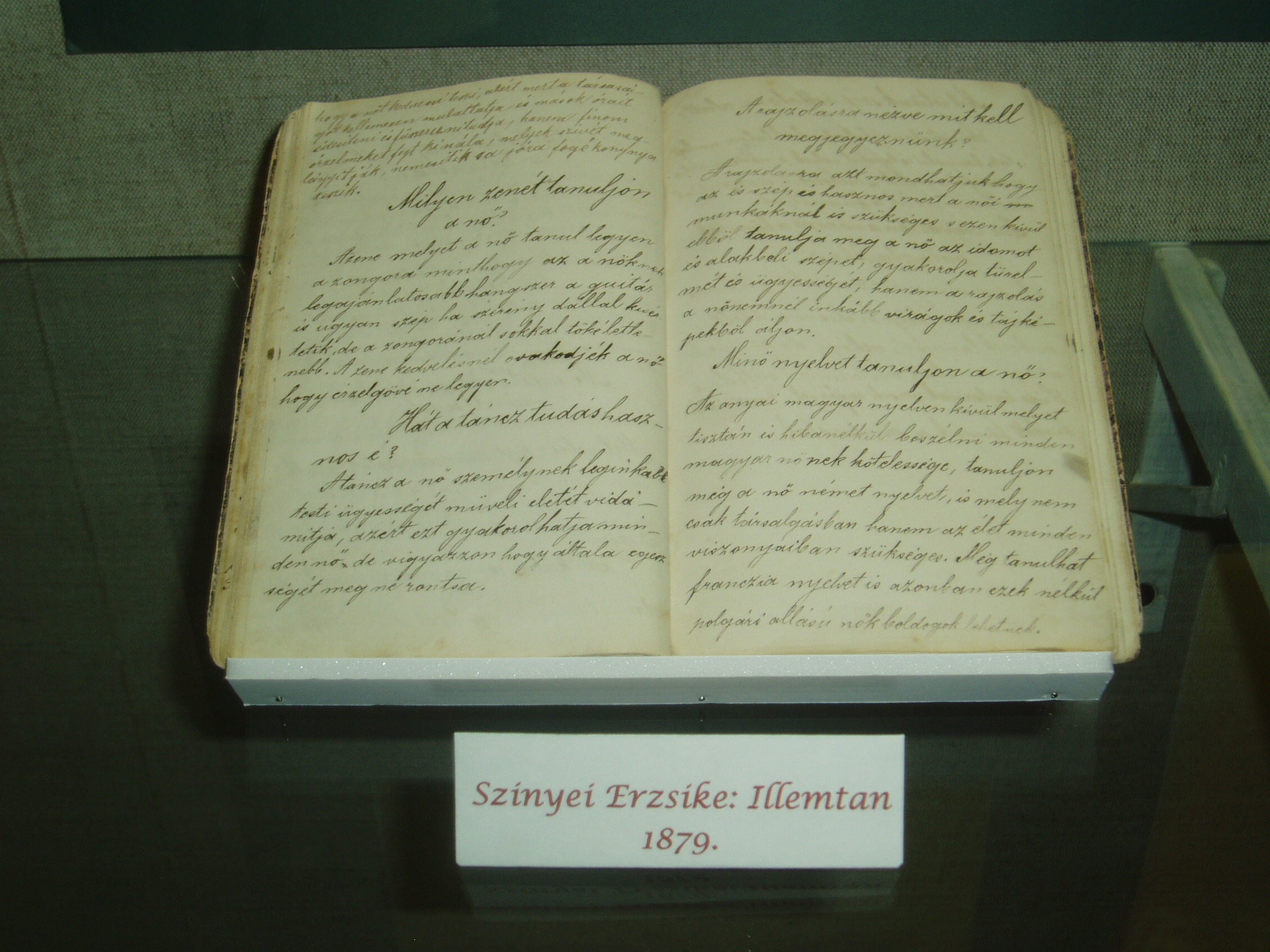 Nyilvános 1070 | 1580 | Sárospatak, Rákóczi utca 1. Református Kollégium | A Kollégium főépületének szárnyai által határolt tágas udvarban áll a régi iskolaépületek utolsó maradványa, az ún. Berna-sor. 1771/72-ben a fizika oktatása számára és a fizikaprofesszor lakásául épült. Az egyemeletes, hosszú szárny déli oldalát később kétszintes, árkádos tornáccal bővítették, feljáróval a nyugati oldalon. Az épület a korabeli provinciális magyar építészet szép példája. Az emelet boltozott termeiben a kollégium történetét bemutató kiállítást rendeztek be. A képen egy XIX. századi fiatal lány, Szinnyei Erzsike 1879-ben kézzel írt illemtankönyve látható. A fénykép 2007 augusztusában készült. Felh. irod.: Détsy Mihály: Sárospatak. Bp. Corvina, 1974 |