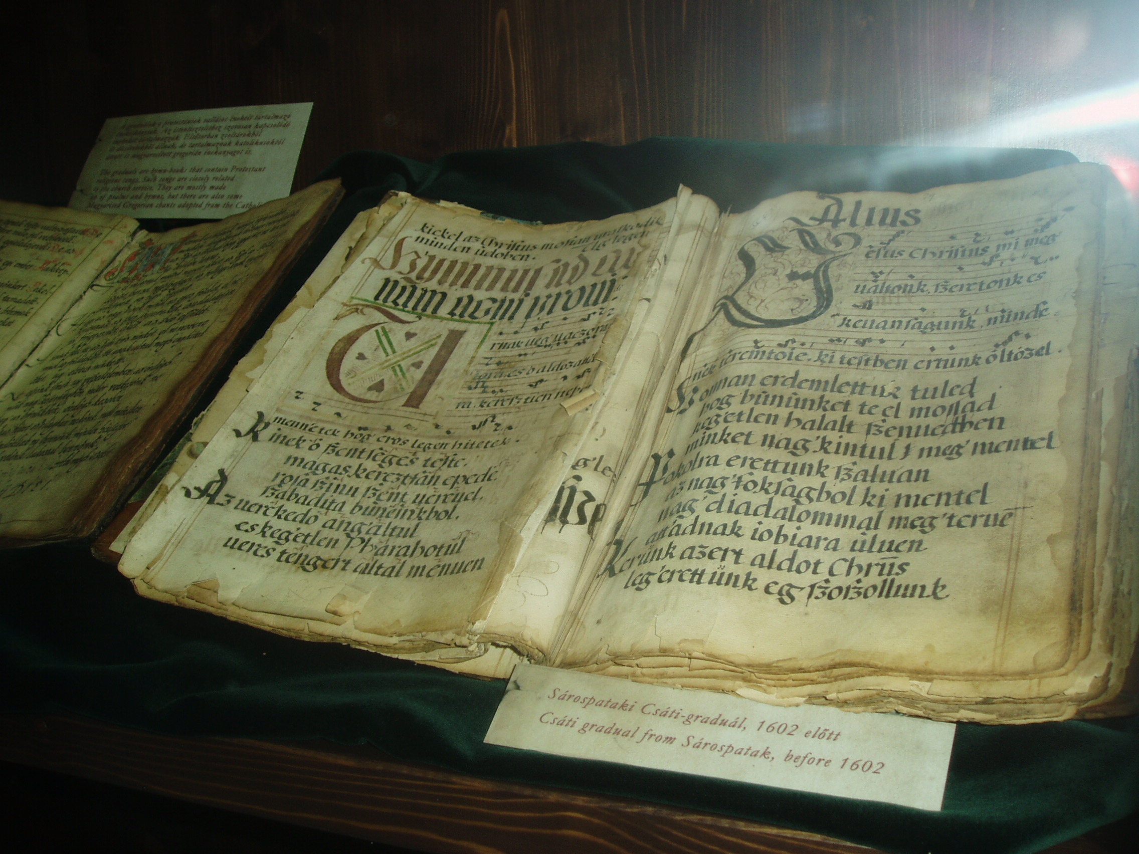 Nyilvános 1125 | 1552 | Sárospatak, Rákóczi utca 1. Református Kollégium könyvtára | Az 1531-ben alapított Sárospataki Református Kollégium könyvtára évszázadok óta az ország egyik legértékesebb könyvgyűjteménye. A második világháború előestéjén, 1938-ban állománya legbecsesebb részét Budapestre menekítették. Sajnos, nem lehetett előre látni, hogy a Sárospatakot elfoglaló szovjet csapatok megkímélték a kollégiumi könyvtárat, míg a Budapestre került kötetek a hadi események során eltűntek. Sorsukról sokáig semmit sem lehetett tudni, csak harminc év múlva derült ki, hogy a Nyizsnyij Novgorod-i Lenin Könyvtár egy részlegében őrzik őket. A rendszerváltás után tárgyalásokba lehetett bocsátkozni visszaadásukról, amelyre, sok vita után 2006. áprilisában kerülhetett sor. A hazatért 16–17. századi könyvek értéke nem pusztán azért felbecsülhetetlen, mert könyvritkaságokról van szó, hanem azért is, mert az elmúlt századokban ezeket a könyveket olvasták a kollégium diákjai, tanárai. A 96 latin, 33 magyar és 6 német nyelvű könyv több mint hatvan százaléka imádságoskönyv, a többi orvosi, jogi, történeti és útleíró mű. A visszaadott dokumentumok egyik nagy értéke a képen látható Csáti graduál. Az 1602 körül keletkezett kéziratos énekeskönyv 41 XVII. század előtti egyházi éneket tartalmaz. Bejegyzése szerint: „…Találtatott Tsáton… Szabó István urnál … a sárospataki reformata anya oskolának ajándékozta tiszt. Nagy Ferencz Ur 1799ik esztendőben.” A fénykép 2007 augusztusában készült. Felh. irod.: Détsy Mihály: Sárospatak. Bp. Corvina, 1974 www.gradatio.hu/nagykonyvtar Fehér Katalin: Hazatértek a sárospataki könyvek. = Könyv és nevelés 2006. 2. www.hik.hu/tankonyvtar/site/books/b91/ch03.html |