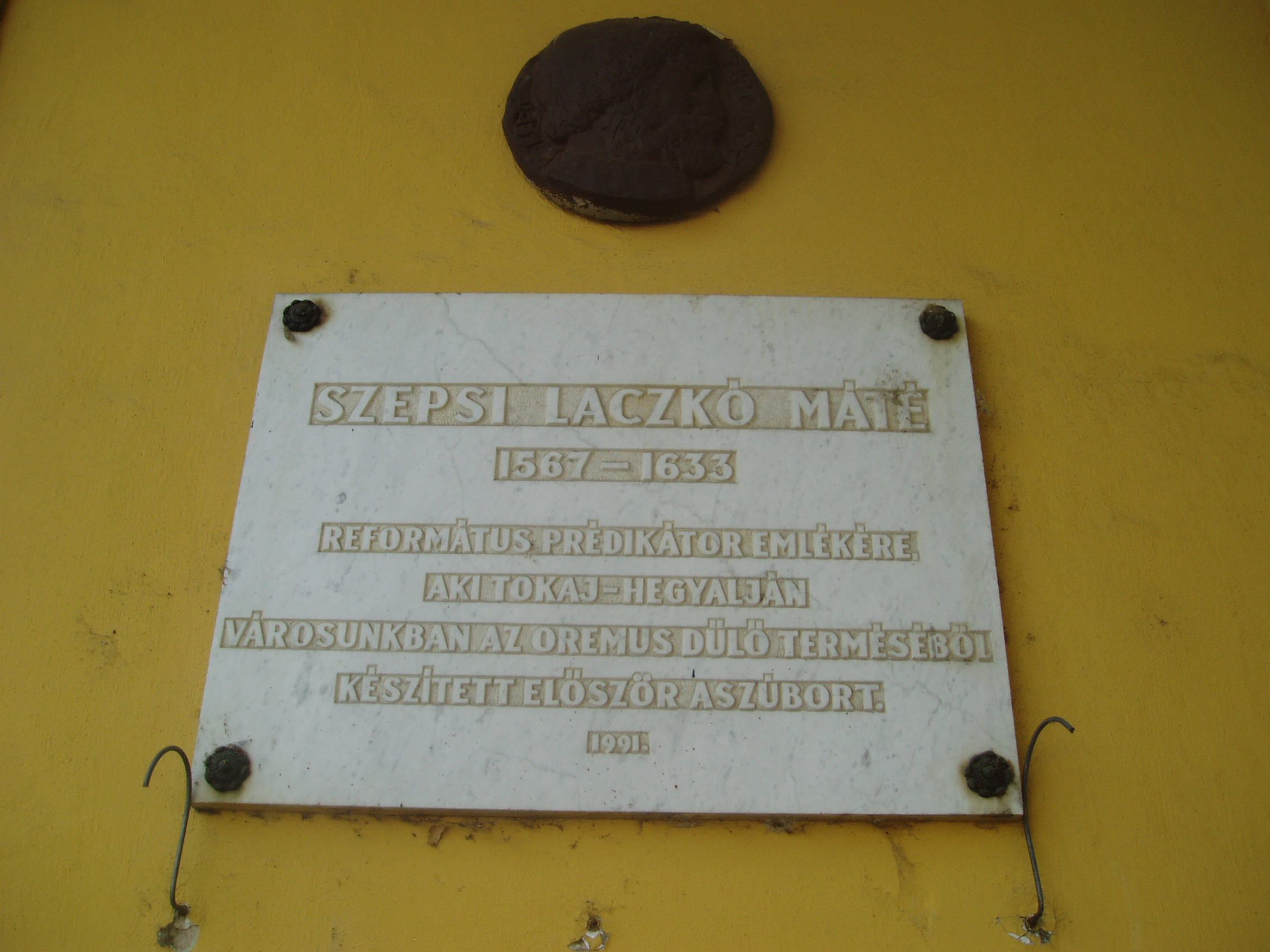 Nyilvános 1085 | 1618 | Sátoraljaújhely, Kossuth tér 24. | A város fő terének egyik szép, régi épületén elhelyezett emléktábla szerint elsőként Sátoraljaújhelyen készített tokaji aszút 1631 körül Szepsi Laczkó Márton (1567-1633) református prédikátor, Lórántffy Zsuzsanna udvari lelkésze a fejedelemasszony számára az Oremus dűlő terméséből. A hagyomány szerint az országot érő támadások miatt későn szüretelt szőlő tartalmazott olyan „beteg” szőlőszemeket is amelyeket ma az aszú készítéséhez használnak. Az elkészült, miseborként is használt italban fedezte fel Szepsi Laczkó Máté a különleges ízvilágot és ajánlotta fel a bort a fejedelemasszonynak. Az aszú készítésének első leírását is neki tulajdonítják. A hagyománynak azonban ellentmond, hogy már az 1590-es években - Szikszai Fabricius Balázs latin–magyar szótárában - használták az „aszú szőlő” kifejezést. A fénykép 2007 augusztusában készült. Felh. irod.: www.tokaj.hu/magyar/atokaji/az-aszu/index.php |