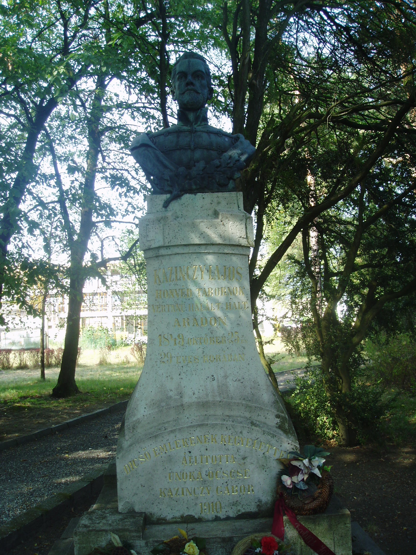 Nyilvános 1107 | 1638 | Széphalom: A Kazinczy család sírkertje - Kazinczy Lajos szobra | A Kazinczy Emlékcsarnok parkja - Kazinczy Ferenc egykori kúriájának kertje - ma természetvédelmi terület. A mauzóleumból fasor vezet a Kazinczy család sírkertjébe. A kis temető helyét 1806-ban, első gyermeke, az egyéves korában elhunyt Iphigenia halálakor Kazinczy maga jelölte ki. Már akkor megírta barátainak, hogy felesége és ő is oda fognak temetkezni. Legkisebbik fiuk, Lajos, Aradon szenvedett vértanúhalált a honvédsereg ezredeseként. 1849. október 25-én, 29 éves korában végezték ki. Földi maradványait az aradi vársánc rejti. Szülei sírjának közelében felállított mellszobra idézi emlékét. A szobor másolata a sárospataki kollégium kertjében látható (lásd: Sárospatak, Iskolakert: Kazinczy Lajos). A fénykép 2007 augusztusában készült. Felh. irod.: Látnivalók Borsod-Abaúj-Zemplén megyében. Miskolc, Well-PRess, 2004 www.vendegvaro.hu Pávai Gyula: Kazinczy Lajos emléktáblája Aradon. = Széphalom. A Kazinczy Ferenc Társaság Évkönyve 13. kötet, 2003 |