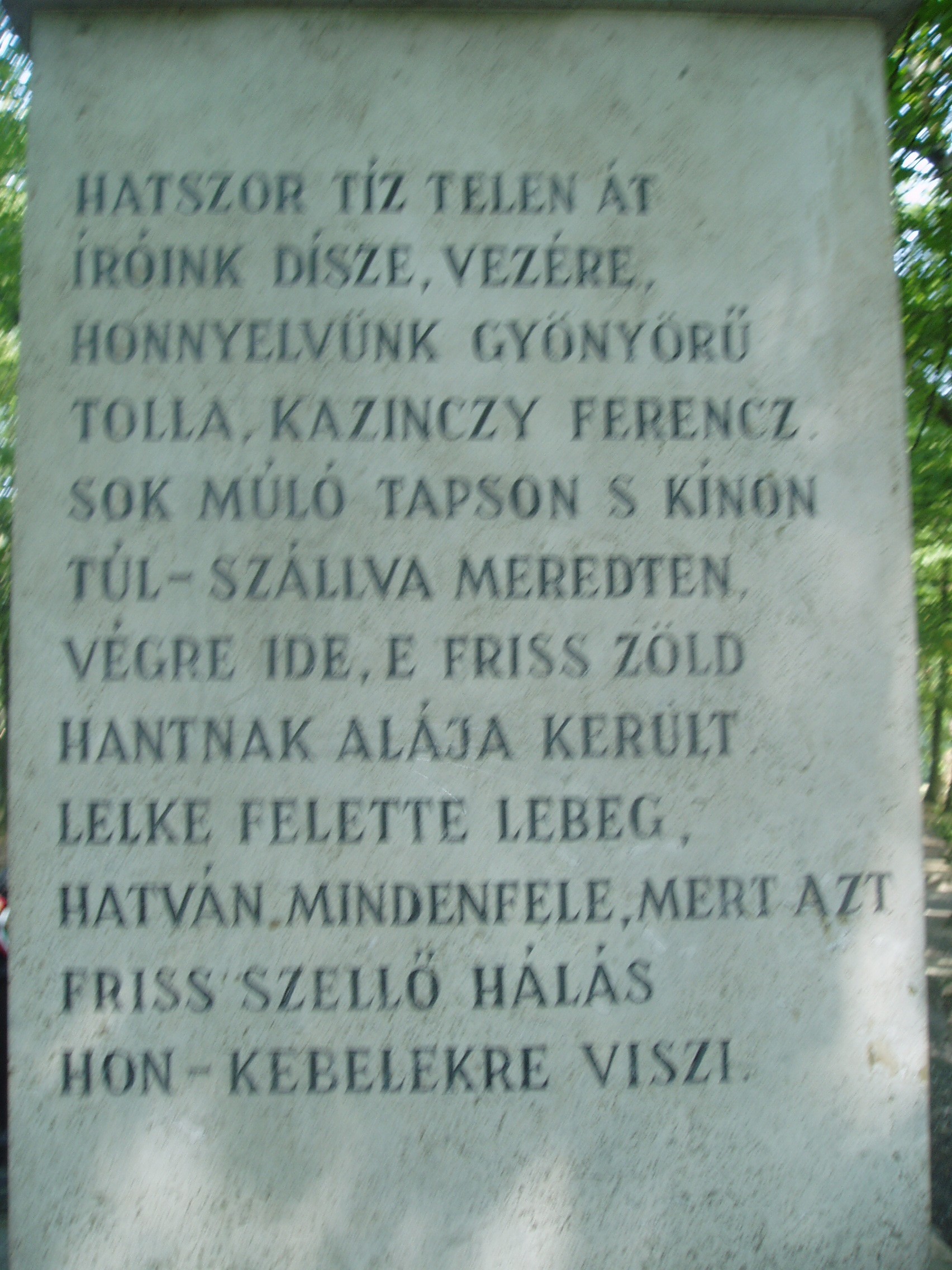 Nyilvános 1076 | 1672 | Széphalom: A Kazinczy család sírkertje - Kazinczy Ferenc sírja | A Kazinczy Emlékcsarnok parkja - Kazinczy Ferenc egykori kúriájának kertje - ma természetvédelmi terület. A mauzóleumból fasor vezet a Kazinczy család sírkertjébe. A sírkert helyét 1806-ban, első gyermeke, az egyéves korában elhunyt Iphigenia halálakor Kazinczy maga jelölte ki. Már akkor megírta barátainak, hogy felesége és ő is oda fognak temetkezni. Kazinczy Ferenc 1831. augusztus 22-én hunyt el széphalmi otthonában. Sírja már a reformkorban zarándokhely lett. Járt itt Petőfi Sándor is 1847. júliusában. Az emlékoszlop alatt nyugszik az író és felesége, az oszlop körül pedig négy gyermekük, két unokájuk, három dédunokájuk és az a szolgálójuk, aki Kazinczyval együtt raboskodott Munkács várában. Legkisebbik fiuk, Lajos, Aradon szenvedett vértanúhalált a honvédsereg ezredeseként. A fénykép 2007 augusztusában készült. Felh. irod.: Látnivalók Borsod-Abaúj-Zemplén megyében. Miskolc, Well-PRess, 2004 www.vendegvaro.hu Busa Margit: Adalékok a Kazinczy család történetéhez. = Széphalom. A Kazinczy Ferenc Társaság Évkönyve 12. kötet, 2002 |