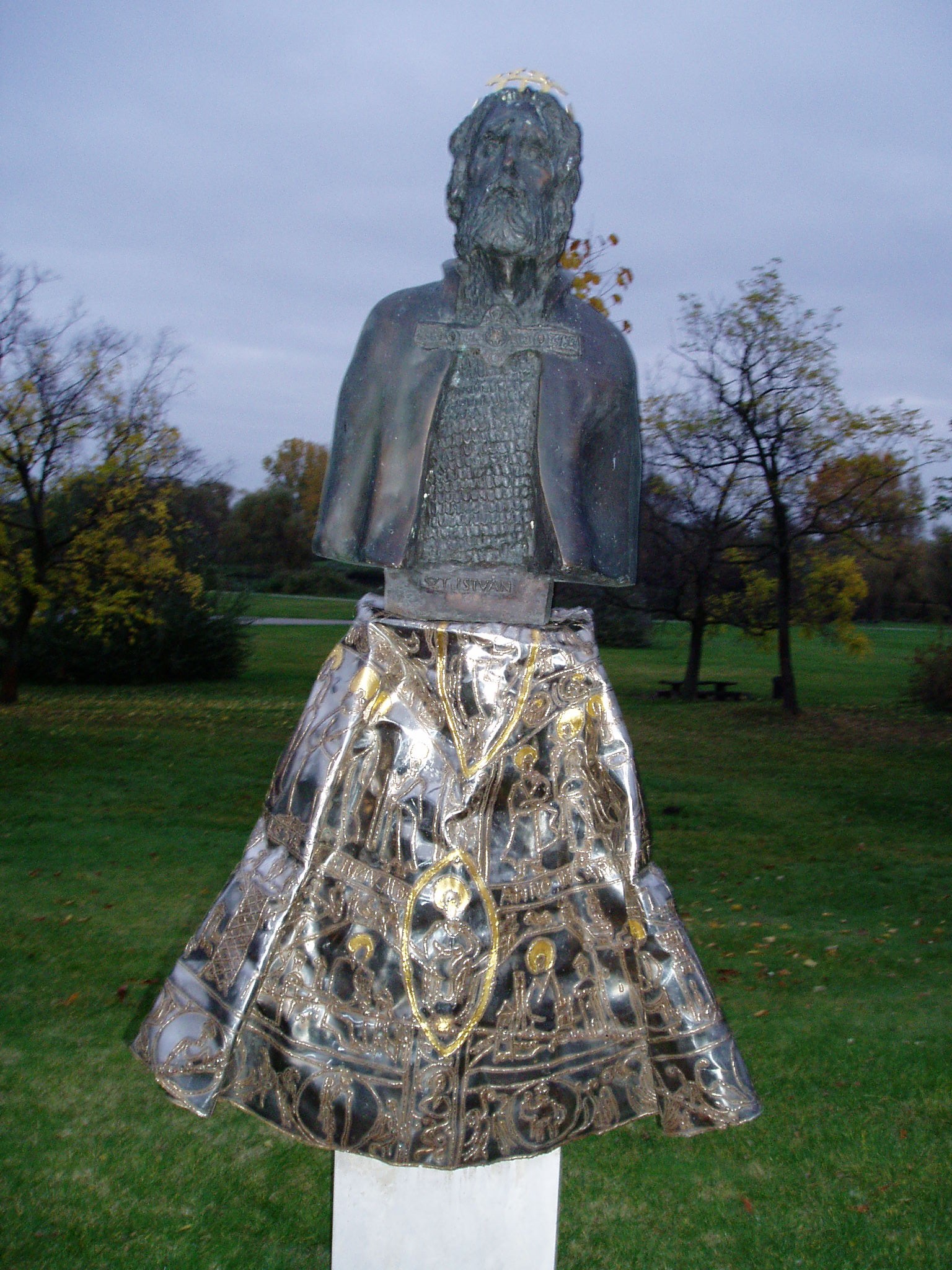 Nyilvános 1257 | 2159 | Ópusztaszer: Szent István szobra | Az ópusztaszeri Megyék Történelmi Szoborparkjában Csongrád megye állíttatta I. István király szobrát, mely Varga Imre alkotása. A szobor a romantikus Szent István ábrázolásokkal merészen szakító portré, a korhű István-ábrázolások ihletett továbbgondolása. Arcvonásai felidézik a nomád elődök életvitelén edződött férfiúi jellemvonásokat éppúgy, mint az energikus, magabiztos, hatalma és ereje tudatában lévő államférfi, a keresztény király erényeit. Az aranyozott, krómacél lemezből formált koronázó palást a fél alakot tartó oltárszerű talapzatra borul, Szent István testének megformálójaként jelképesen eggyé forrasztja Szent Istvánt és művét, a keresztény Magyarország megteremtését. A fénykép 2004 októberében készült. Felh. irod.: www.csongrad-megye.hu/turizmus/szoborpark/02.htm |