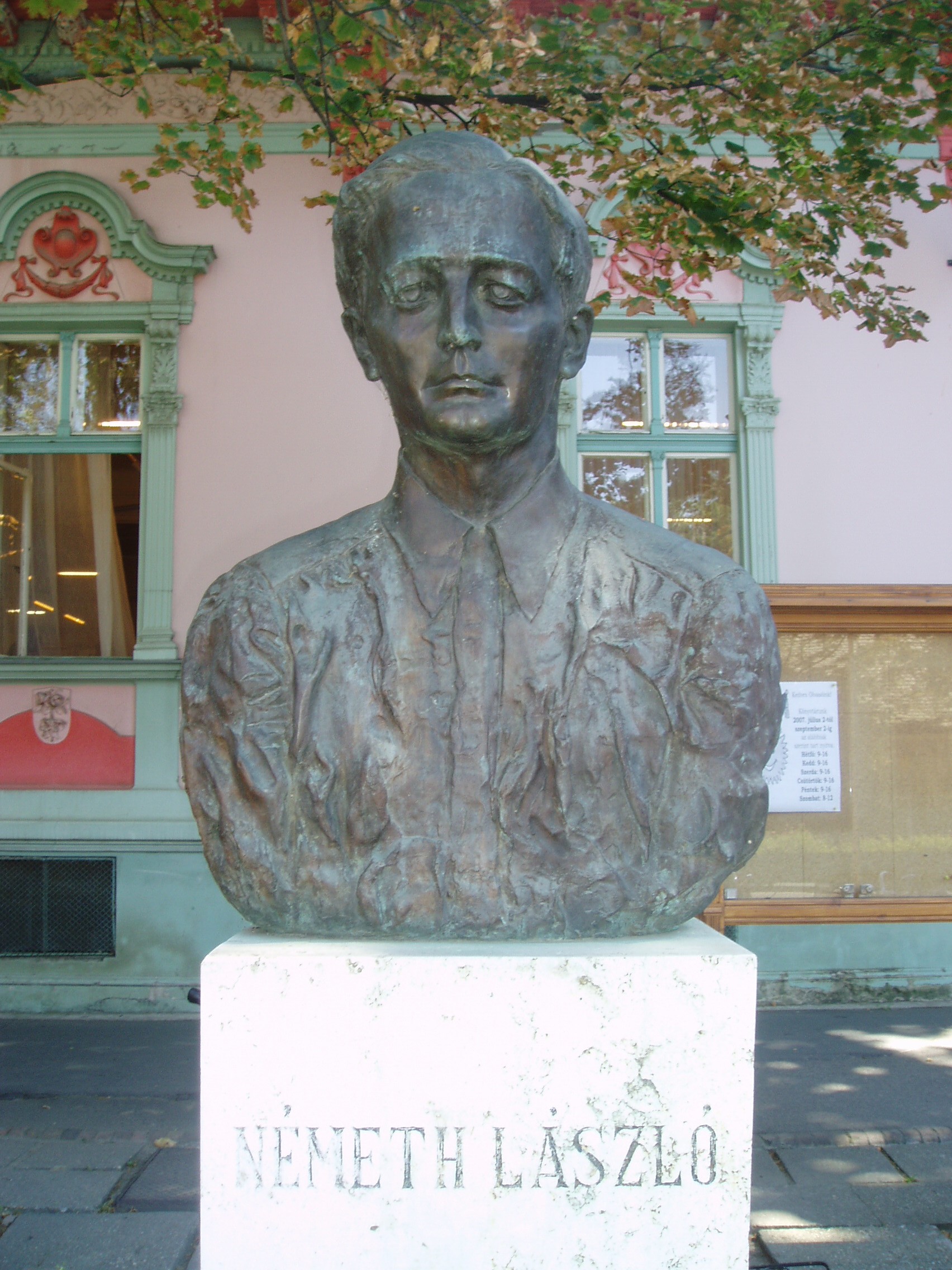 Nyilvános 1538 | 3241 | Hódmezővásárhely, Andrássy út 44. Németh László mellszobra a Németh László Városi Könyvtár előtt | A könyvtárat 1880-ban alapította a város közgyűlése. A vásárhelyi kötődésű nagy író nevét 1976-ban vette fel. Németh László a második világháborút követően több évig élt a városban. Irodalmat és matematikát tanított, s írói munkássága is rendkívül termékeny volt. Több művében, így például az Égető Eszterben is feldolgozta a vásárhelyi polgárok életét. A könyvtár épülete előtt Tóth Valéria által készített mellszobra, az épületben pedig emlékszoba idézi a XX. század egyik legnagyobb gondolkodójának szellemiségét. A Németh László Városi Könyvtár helyismereti különgyűjteménye négyezer olyan kötetet tartalmaz, amely vásárhelyi szerző műve, vagy a városról szól. A gyűjtemény őrzi többek között József Attila Medvetánc című kötetének első kiadását. A könyvritkaságok közül említést érdemel Szenci Molnár Albert (1574-1634) 1608-ban kiadott Szent Bibliája. A fénykép 2007 júliusában készült. Felh. irod.: Arató László - Bátyi Zoltán: Hódmezővásárhely az alföldi művészváros. Hódmezővásárhely, 2004 www.hodmezovasarhely.hu www.nlvk.hu/emlekszoba.php |