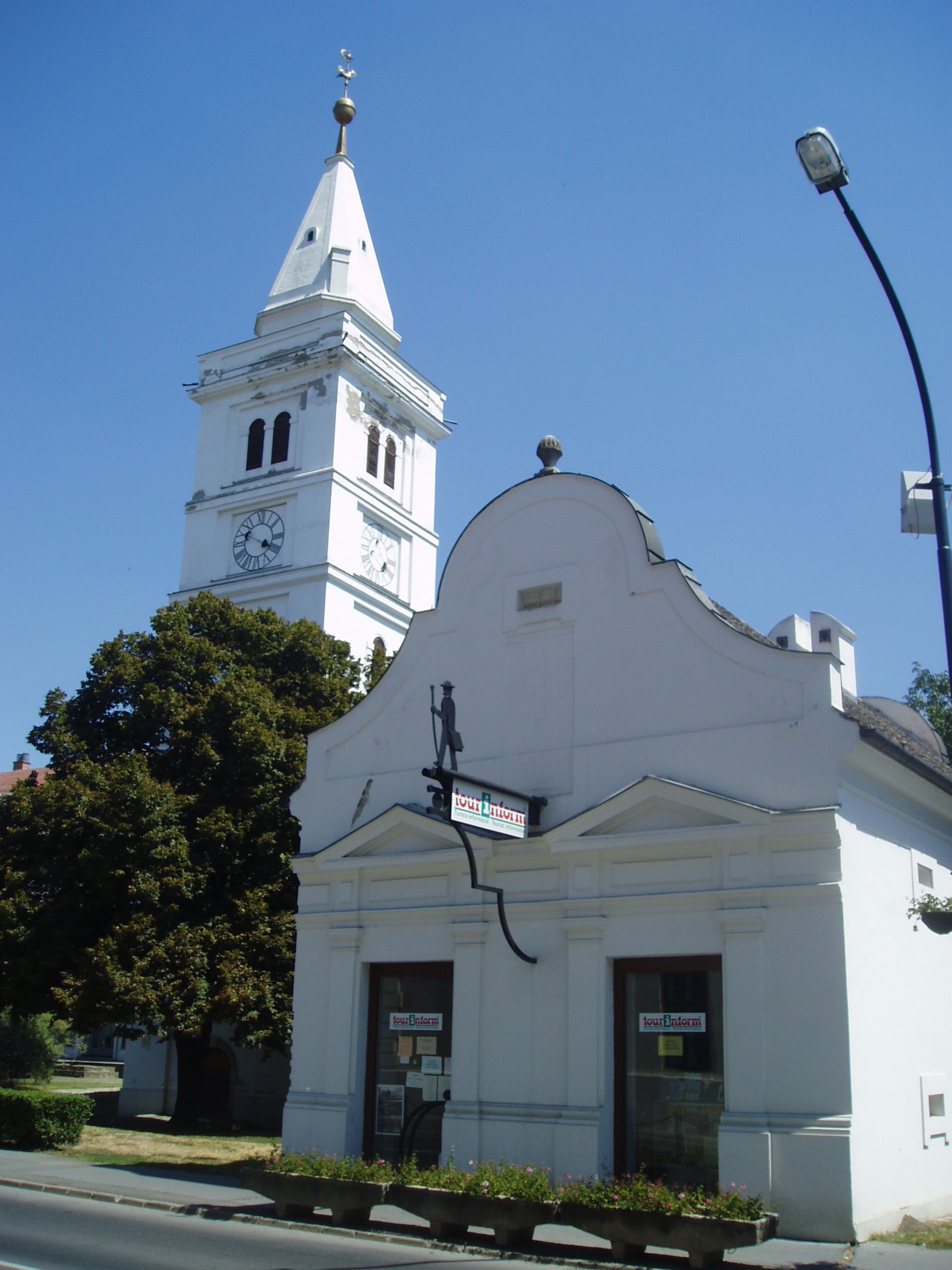 Nyilvános 1530 | 3780 | Rövid leírás | Teljes leírás (1.96 KB) | Hódmezővásárhely, Kossuth tér: Református Ótemplom és Magtár A parkosított Kossuth tér a város főtere. Délkeleti sarkán áll a város legrégibb, legjelentősebb műemléke, a református ótemplom és a vele hajdan szerves kapcsolatban álló magtár. A templom fiókos dongaboltozatú hajója 1721 és 1723 között készült el. Két évtized múlva a templom köré lőréses téglafalat építettek, amelynek keleti és déli szakasza ma is megvan. A templom tornyában helyezték el a nagyecsedi kastély II. Rákóczi Ferenctől elkobzott óráját, csengettyűjét, amelyeket a város akkori földesura, gróf Károlyi Sándor adott el az egyháznak. A templom hajdan kazettás, festett, stilizált virágmotívumokkal díszített fatáblás mennyezetét és karzatát a budapesti Iparművészeti Múzeum, a papok padját a helyi Tornyai János Múzeum (lásd: Hódmezővásárhely, Szántó–Kovács János u. 16–18.) őrzi. A templom jeles lelkésze volt Szőnyi Benjámin (1717–1794). Megválasztása után, 1743-ban külföldi tanulmányútra ment: az Odera–menti Frankfurt, Leyden és Utrecht egyetemein hallgatott teológiát. Hazaérkezése után csaknem ötven évig működött ebben a templomban. Országos elismerést szerzett teológiai témájú könyveivel, valamint számos kiadást megért "Szentek hegedűje" című énekeskönyvével. Feliratos sírköve — epitáfiuma — a templom falánál látható. A templomi magtárat 1744-ben építtette az egyház a lakosságtól egyházi adóként begyűjtött termények és tárgyak tárolására. A jellegzetesen barokk homlokzatú épületben ma a Tourinform iroda működik. A fénykép 2007 júliusában készült. Felh. irod.: Barangolások Csongrád megyében. Miskolc, Well-PRess, 1997 /Vendégváró/ Arató László - Batyi Zoltán: Hódmezővásárhely az alföldi művészváros. Hódmezővásárhely, 2004 |