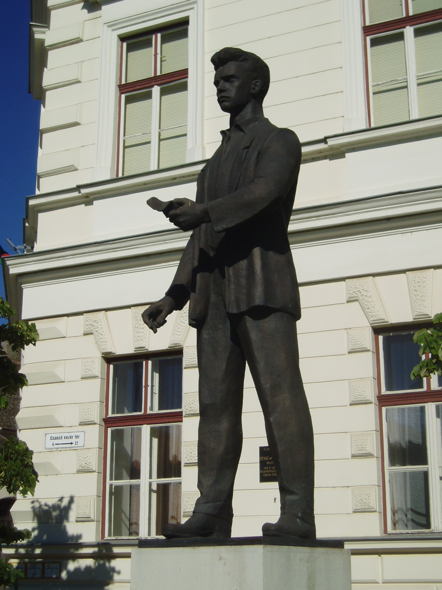 Nyilvános 1189 | 1748 | Makó, Csanád vezér tér 6. József Attila Gimnázium | A város központjából északra nyílik a sugárútszerű Csanád vezér tér. Nyugati oldalán áll a József Attila Gimnázium 1895-ben, eklektikus stílusban, Gerle Lajos tervei alapján emelt épülete. Itt tanított négy évig Juhász Gyula, itt tanult József Attila, majd Erdei Ferenc. A tizenöt és fél éves József Attila 1920 októberében érkezett Makóra. Verseire Juhász Gyula figyelt fel, akinek pártfogása révén a nyugat is közölt néhányat belőlük. Makói diák volt, amikor tizenhét éves korában Szegeden megjelent első verseskötete, a "Szépség koldusa", Juhász Gyula prófétikus előszavával: "A legnagyobb készséggel és örömmel vállalkoztam arra, hogy József Attila első verses könyvéhez előszót írjak. Ez a nagyon fiatal és nagyon tehetséges költő a legteljesebb mértékben megérdemli, hogy a figyelem feléje forduljon, hogy igaz szeretettel és reménységgel fogadja a magyar olvasóközönség és hogy a kritika se menjen el mellette közömbösen vagy ellenségesen és ne elégedjék meg vele szemben a nyomtatásban megjelenőknek rendesen kijáró vállveregetéssel. József Attila Isten kegyelméből való költő." Az épület előtt áll 2005-ben, születése centenáriumán újjáavatott szobra, a járdába ágyazottan pedig első verseskötetének bronzba öntött címlapja idézi emlékét. A fénykép 2007 júliusában készült. Felh. irod.: Barangolások Csongrád megyében. Miskolc, Well-PRess, 1997 |
