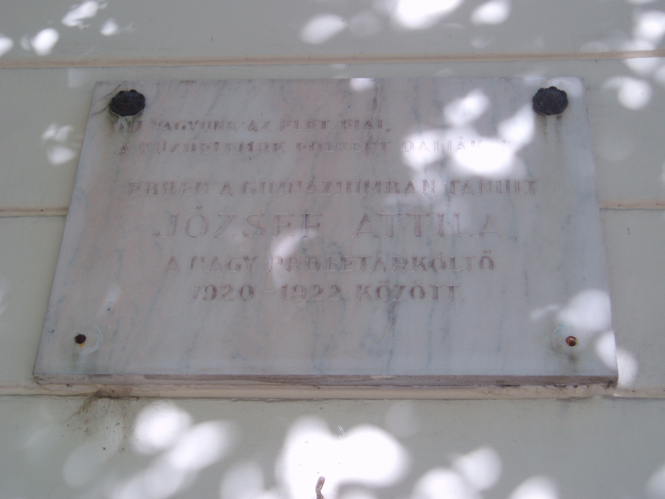 Nyilvános 1103 | 1661 | Makó, Csanád vezér tér 6. József Attila Gimnázium | A város központjából északra nyílik a sugárútszerű Csanád vezér tér. Nyugati oldalán áll a József Attila Gimnázium 1895-ben, eklektikus stílusban, Gerle Lajos tervei alapján emelt épülete. Itt tanított négy évig Juhász Gyula, itt tanult József Attila, majd Erdei Ferenc. A tizenöt és fél éves József Attila 1920 októberében érkezett Makóra. Verseire Juhász Gyula figyelt fel, akinek pártfogása révén a nyugat is közölt néhányat belőlük. Makói diák volt, amikor tizenhét éves korában Szegeden megjelent első verseskötete, a "Szépség koldusa", Juhász Gyula prófétikus előszavával: "A legnagyobb készséggel és örömmel vállalkoztam arra, hogy József Attila első verses könyvéhez előszót írjak. Ez a nagyon fiatal és nagyon tehetséges költő a legteljesebb mértékben megérdemli, hogy a figyelem feléje forduljon, hogy igaz szeretettel és reménységgel fogadja a magyar olvasóközönség és hogy a kritika se menjen el mellette közömbösen vagy ellenségesen és ne elégedjék meg vele szemben a nyomtatásban megjelenőknek rendesen kijáró vállveregetéssel. József Attila Isten kegyelméből való költő." Az épület előtt áll 2005-ben, születése centenáriumán újjáavatott szobra, a járdába ágyazottan pedig első verseskötetének bronzba öntött címlapja idézi emlékét. A fénykép 2007 júliusában készült. Felh. irod.: Barangolások Csongrád megyében. Miskolc, Well-PRess, 1997 |