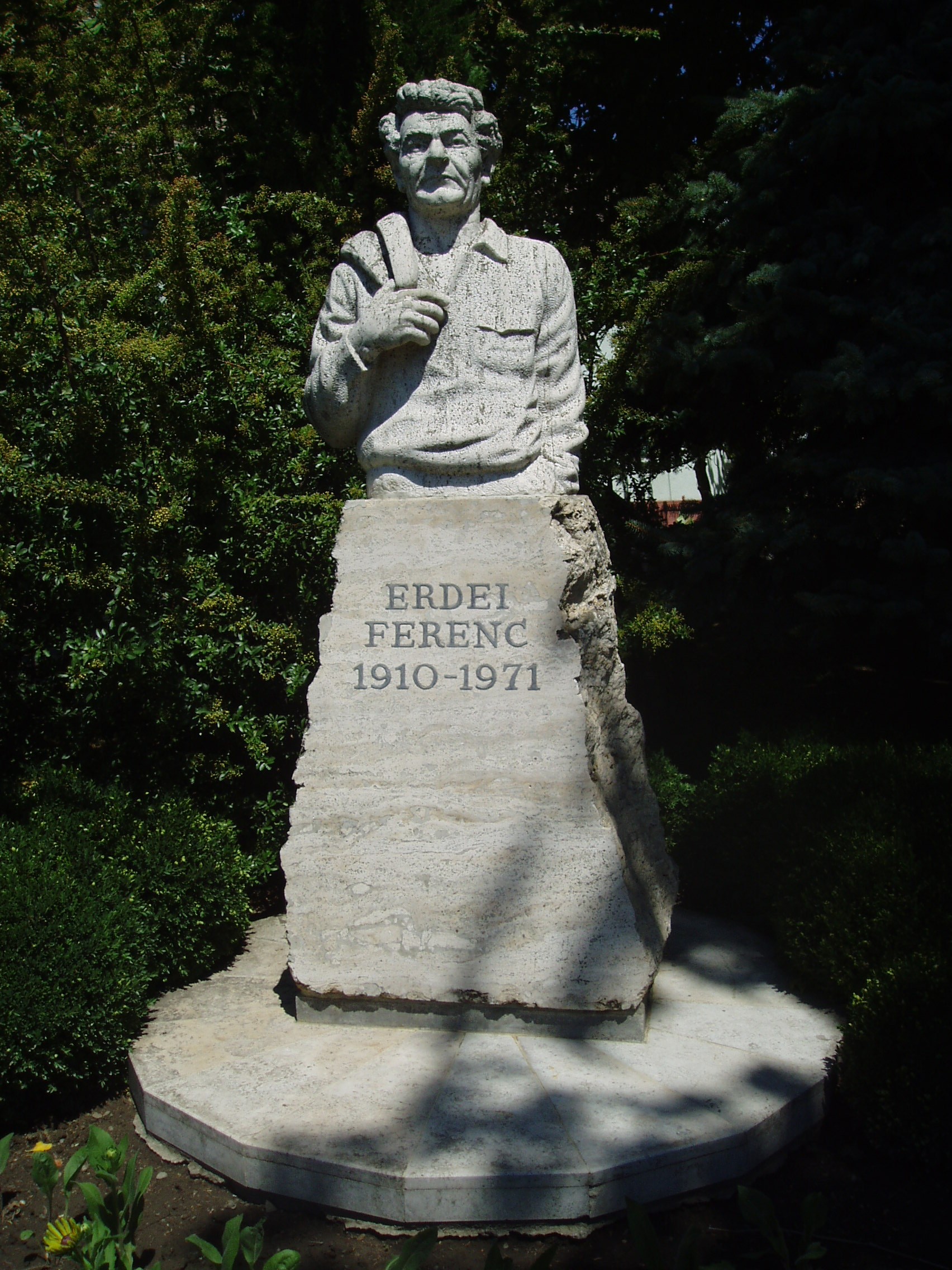 Nyilvános 1182 | 1784 | Makó, Erdei Ferenc tér: Erdei Ferenc szobra | A Megyeház utcán végigmenve jutunk az Erdei Ferenc térre. A tér 9. számú házának helyén állt valaha Erdei Ferenc (1910-1971) agrárközgazdász, politikus, szociográfus, tudományszervező szülőháza, amelyet a József Attila Múzeum udvarán (lásd: Makó, Megyeház u. 4.) udvarán rekonstruáltak. A róla elnevezett téren állították fel Makó nagy szülöttének szobrát, aki végakaratának megfelelően a közeli református temetőben nyugszik. A fénykép 2007 júliusában készült. Felh. irod.: Barangolások Csongrád megyében. Miskolc, Well-PRess, 1997 |