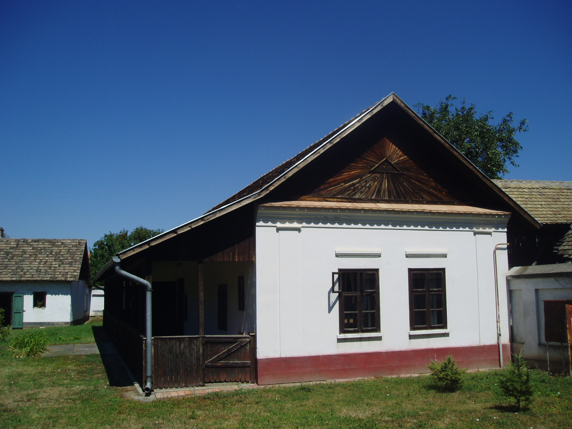 Nyilvános 1134 | 1478 | Makó, Megyeház utca 4. József Attila Múzeum | A múzeum, melynek eredete 1885-re vezethető vissza, de hivatalosan csak 1950-ben jött létre, 1981-ben költözött be a Vincze Mihály által tervezett mai épületbe. A homlokzatot Varga Imre 1981-ben készített fakompozíciója díszíti. A múzeum udvarán kisebb szabadtéri néprajzi együttes létesült. A képen (1910-1971) politikus, agrárközgazdász rekonstruált szülőháza látható (lásd még: Makó, Erdei Ferenc tér). A fénykép 2007 júliusában készült. Felh. irod.: Barangolások Csongrád megyében. Miskolc, Well-PRess, 1997 www.mfm.u-szeged.hu/index.php?id=muzeumaink-mako |