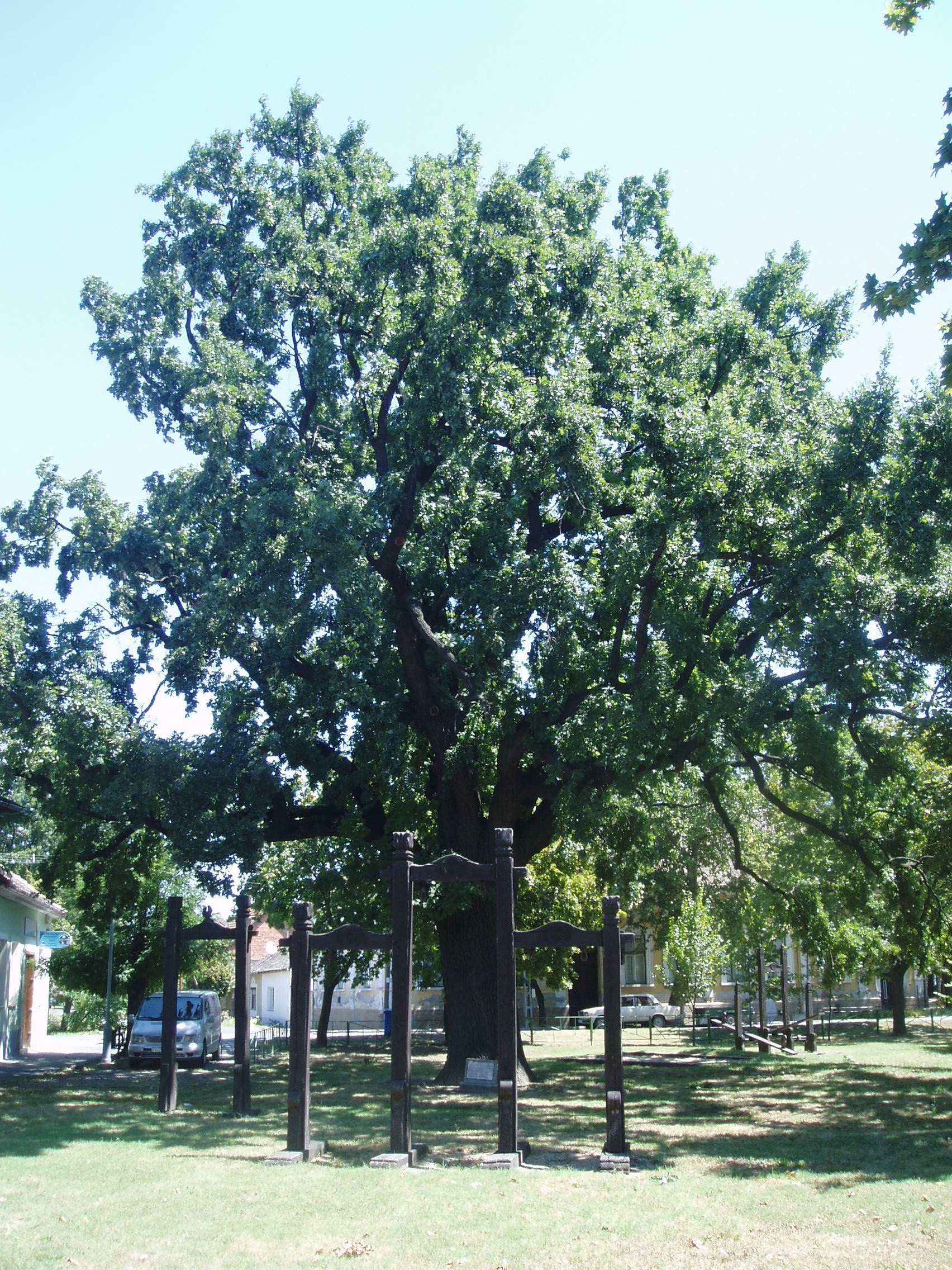 Nyilvános 1113 | 1668 | Makó, Megyeház utca 16. Juhász Gyula-emlékfa | A Megyeház utca 16. számú ház előtti kis parkban áll a Juhász Gyula-emlékfa. A másfél méter törzsátmérőjű kocsányos tölgyet az 1810-es években ültették. Juhász Gyula gyakran kereste fel makói tartózkodása idején. A fénykép 2007 júliusában készült. Felh. irod.: Barangolások Csongrád megyében. Miskolc, Well-PRess, 1997 |
