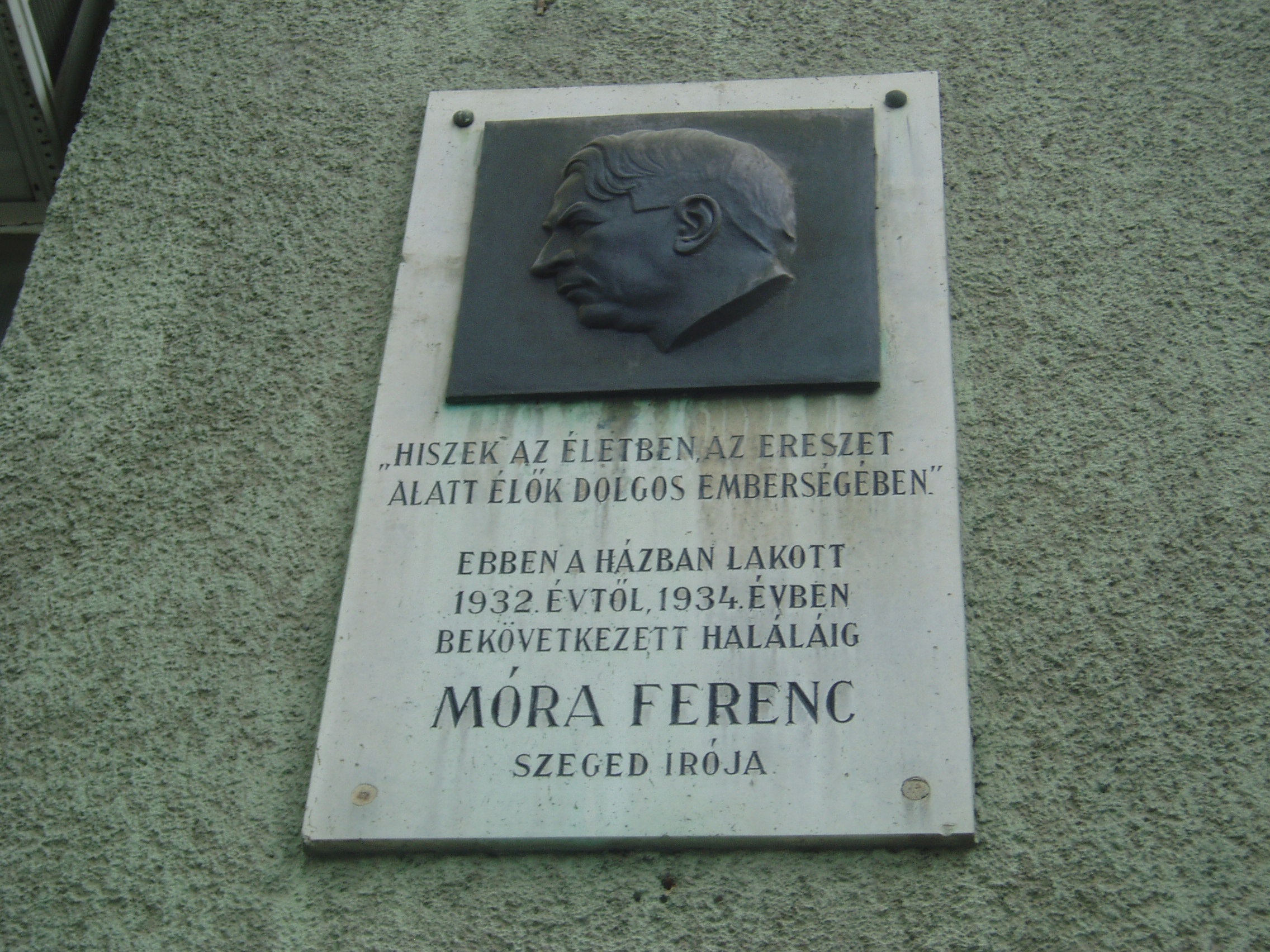 Nyilvános 1129 | 1639 | Szeged, Boldogasszony sugárút 15. | Az alaposan átalakított városi házban volt Móra Ferenc utolsó lakása. 1932-ben költözött ide a Kölcsey utca 10. szám alatti lakásából. Új otthonát csak rövid ideig élvezhette, rátört a súlyos betegség, a hasnyáálmirigyrák. Halála előtt két hónappal itt kereste fel őt az erdélyi írók küldöttsége: Tamási Áron, Bánffy Miklós, Kemény János, Kós Károly és Ligeti Ernő. 1934. január 20-án a szegedi ipartestület küldöttségét fogadta lakásában. A foltozó szűcs fia ekkor vallotta magát "nemzeti szolgálómesternek". 1934. február 8-án hunyt el, sírja a Belvárosi temetőben (lásd: Szeged, Fonógyári út) van. Az épületen lévő emléktábláját Tápay Antal készítette. A fénykép 2007 júliusában készült. Felh. irod.: Péter László: Szeged. Bp. Panoráma, 1981 |
