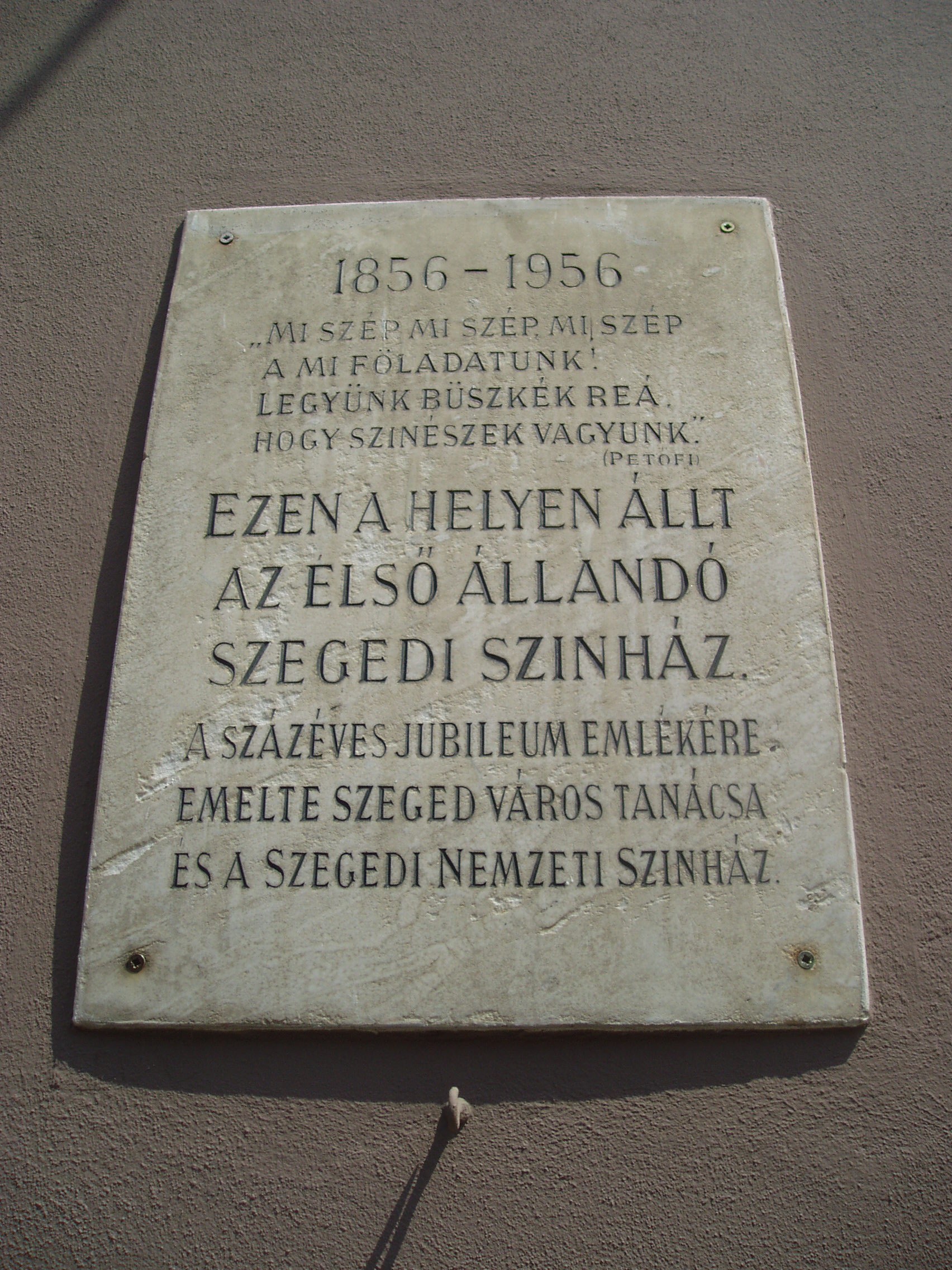 Nyilvános 1096 | 1606 | Szeged, Kelemen László utca 3. | Itt, a mai Hági étterem kerthelyiségének helyén állott Szeged első állandó, 1856-ban fából épült színháza, amelynek a Sörkert utcai homlokzaton állítottak emléktáblát. Az utcát az 1879-es árvízig Színház utcának is nevezték, ma pedig Kelemen László, az első magyar színigazgató nevét viseli, aki társulatával hosszabb ideig játszott Szegeden is (lásd: Szeged, Széchenyi tér 10.). Játszott itt Lendvay Márton, Szerdahelyi Kálmán, Prielle Kornélia. A színkör életében különösen emlékezetes volt az 1860/61-es évad, amelyet később a szegedi színjátszás aranykorának neveznek a színháztörténészek. Molnár György igazgató műsorpolitikáját egyfelől a közönség szórakoztatása, másfelől a haza iránti elkötelezettség határozza meg. A társulat megérkezésekor robbant ki a „kis forradalom”-nak nevezett tüntetéssorozat, amikor a szegediek a városháza előtt összegyűlve a betiltott Himnuszt, a Klapka– és Kossuth–indulókat énekelték a színészekkel együt, majd leverték az épületekről a császári címereket. A nagy árvízt követő újjáépítéssel szinte egyidőben határozta el a város, hogy méltó kőszínházat emel. A ma is álló épületet (lásd: Szeged, Deák Ferenc utca 12.) 1883-ban adták át rendeltetésének. A fénykép 2007 júliusában készült. Felh. irod.: Péter László: Szeged. Bp. Panoráma, 1981 Sándor János: A szegedi színjátszás krónikája. Szeged, Bába Kiadó, 2003 |