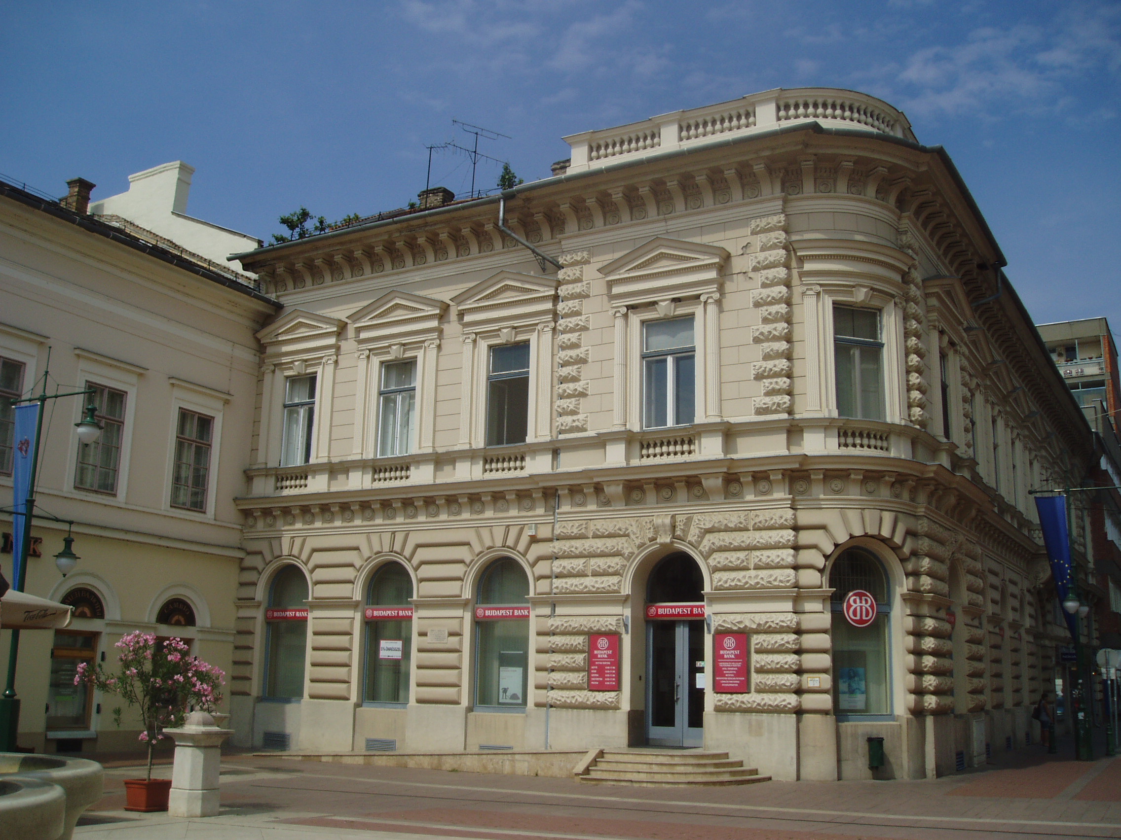 Nyilvános 1075 | 1469 | Szeged, Klauzál tér 4. | A tér nyugati oldalán kiszögellő eklektikus épületben hajdan híres kávéház működött. Tulajdonosa Ströbl József, Tömörkény István anyai nagybátyja volt. A fénykép 2007 júliusában készült. Felh. irod.: Péter László: Szeged. Bp. Panoráma, 1981 |