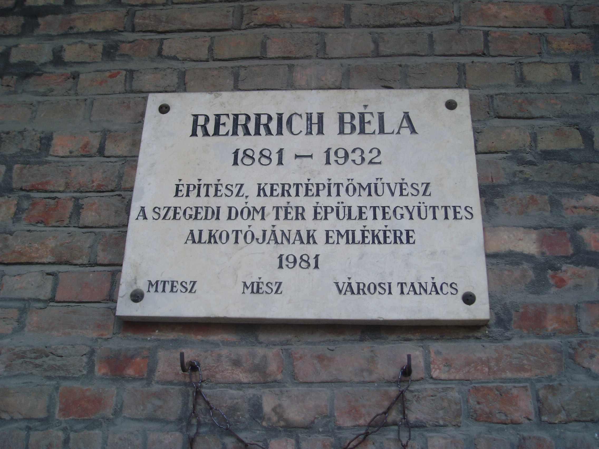 Nyilvános 1080 | 1661 | Szeged, Rerrich tér: Rerrich Béla emléktáblája | A Fogadalmi templommal szinte összeforrott a két világháború közötti időszak legszebb magyar építészeti alkotása, a Rerrich Béla által tervezett árkádos épületcsoport, amely U alakban fogja össze a Bálint Sándor által legartisztikusabb hazai modern térkompozíciónak minősített Dóm teret. A Dóm építésével egyidejűleg merült fel az igény, hogy hangolják össze az egyetemi, illetve püspökségi épületeket. A tér megkomponálására Klebelsberg Kunó kultuszminiszter 1927-ben írt ki pályázatot, amelyet Rerrich Béla (1881-1932) nyert meg. Az épületegyüttes kialakítását 1928-ban kezdték meg. Az égetett, klinkertéglából készült téregyüttest az északeurópai országok építészete ihlette, Rerrich mintája valószínűleg a stockholmi városháza volt. Az épületegyüttes nyugati részein egyetemi kollégium és hittudományi főiskola, délnyugati részein püspöki székház, déli és keleti szárnyán pedig természettudományi és orvosi egyetemi intézetek foglalnak helyet. Rerrich Béla emlékére 1981-ben helyezték el a képen látható szöveges emléktáblát. Alakja domborműként is feltűnik azon az emléktáblán, amelyet a közelben a Dóm téri épületegyüttes kialakításában szerepet játszó személyiségeknek állítottak (lásd: Szeged, Rerrich tér: Dóm tér építési emléktábla). A fénykép 2007 júliusában készült. Felh. irod.: Péter László: Szeged. Bp. Panoráma, 1981 Bálint Sándor: Szeged városa. Bp. Képzőműv. Alap, 1959 |