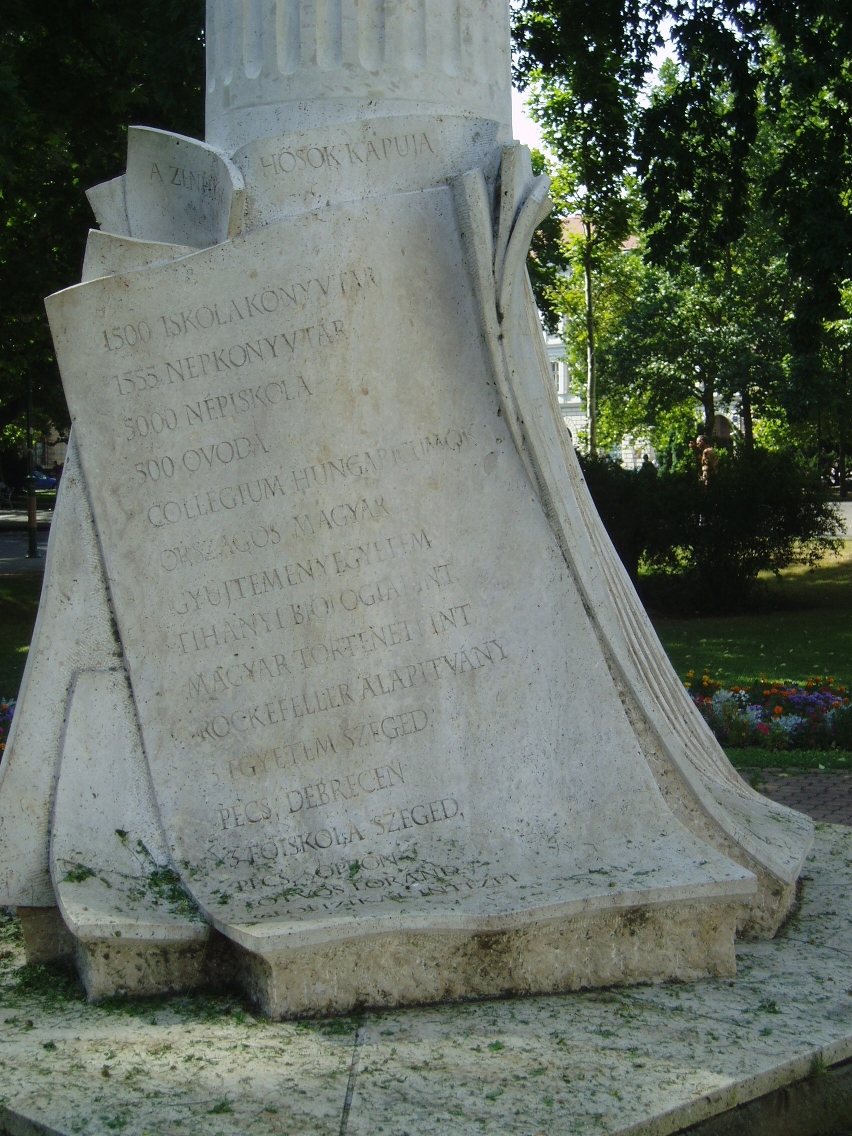 Nyilvános 1129 | 1845 | Szeged, Széchenyi tér: Klebelsberg Kunó emlékműve | A Széchenyi tér hazánk egyik legszebb, legnagyobb, szabályos négyszögű tere. A város közigazgatási és forgalmi központja. 1848-ban Szabadság térnek nevezték el. Mai nevét 1860-ban, Széchenyi István halála után kapta. A mintaszerűen parkosított tér parktükreit művészi értékű szobrok díszítik. A Bérház (lásd: Szeged, Széchenyi tér 11.) előtti parkrész közepén áll Klebelsberg Kunó emlékműve, Melocco Miklós alkotása (2000). A mészkőből készült, szokatlan megformálású emlékmű a tetteiben mérhető politikust és a szellem emberét ábrázolja. Mivel nagyobb léptékű alkotás elkészítésére nem kapott anyagi lehetőséget, Melocco úgy formálta meg a szobrot, hogy feliratokkal utalt Klebelsberg elsősorban kultuszminiszterként végzett példátlanul sokrétű és eredményes tevékenységére. A politikus erősen kötődött Szegedhez, amelynek országgyűlési képviselője volt. Sírja a Fogadalmi templomban van (lásd: Szeged, Dóm: Klebelsberg Kunó sírja). A fénykép 2007 júliusában készült. Felh. irod.: Péter László: Szeged. Bp. Panoráma, 1981 www.szeged.hu Klebelsberg nem ismert lehetetlent. [Halász Zsuzsa beszélgetése Melocco Miklóssal.] = http://mkdsz1.freeweb.hu/n12/09halasz_melocco.htm |