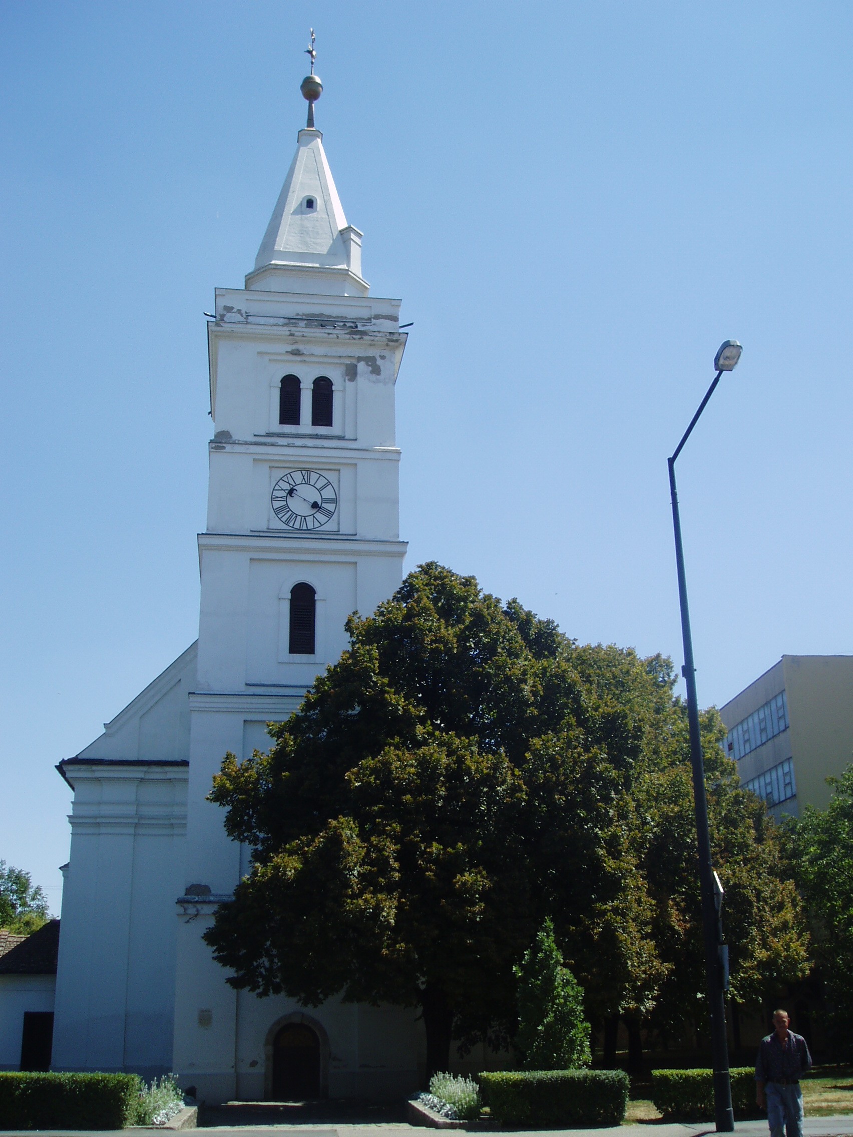 Nyilvános 1496 | 3381 | Hódmezővásárhely, Kossuth tér: Református Ótemplom | A parkosított Kossuth tér a város főtere. Délkeleti sarkán áll a város legrégibb, legjelentősebb műemléke, a református ótemplom és a vele hajdan szerves kapcsolatban álló magtár. Az épület fiókos dongaboltozatú hajója 1721 és 1723 között készült el. Két évtized múlva a templom köré lőréses téglafalat építettek, amelynek keleti és déli szakasza ma is megvan. A toronyban helyezték el a nagyecsedi kastély II. Rákóczi Ferenctől elkobzott óráját, csengettyűjét, amelyeket a város akkori földesura, gróf Károlyi Sándor adott el az egyháznak. A templom hajdan kazettás, festett, stilizált virágmotívumokkal díszített fatáblás mennyezetét és karzatát a budapesti Iparművészeti Múzeum, a papok padját a helyi Tornyai János Múzeum (lásd: Hódmezővásárhely, Szántó–Kovács János u. 16–18.) őrzi. A templom jeles lelkésze volt Szőnyi Benjámin (1717–1794). Megválasztása után, 1743-ban külföldi tanulmányútra ment: az Odera–menti Frankfurt, Leyden és Utrecht egyetemein hallgatott teológiát. Hazaérkezése után csaknem ötven évig működött ebben a templomban. Országos elismerést szerzett teológiai témájú könyveivel, valamint számos kiadást megért "Szentek hegedűje" című énekeskönyvével. Feliratos sírköve — epitáfiuma — az épület külső falánál látható. A fénykép 2007 júliusában készült. Felh. irod.: Barangolások Csongrád megyében. Miskolc, Well-PRess, 1997 /Vendégváró/ Arató László - Batyi Zoltán: Hódmezővásárhely az alföldi művészváros. Hódmezővásárhely, 2004 |