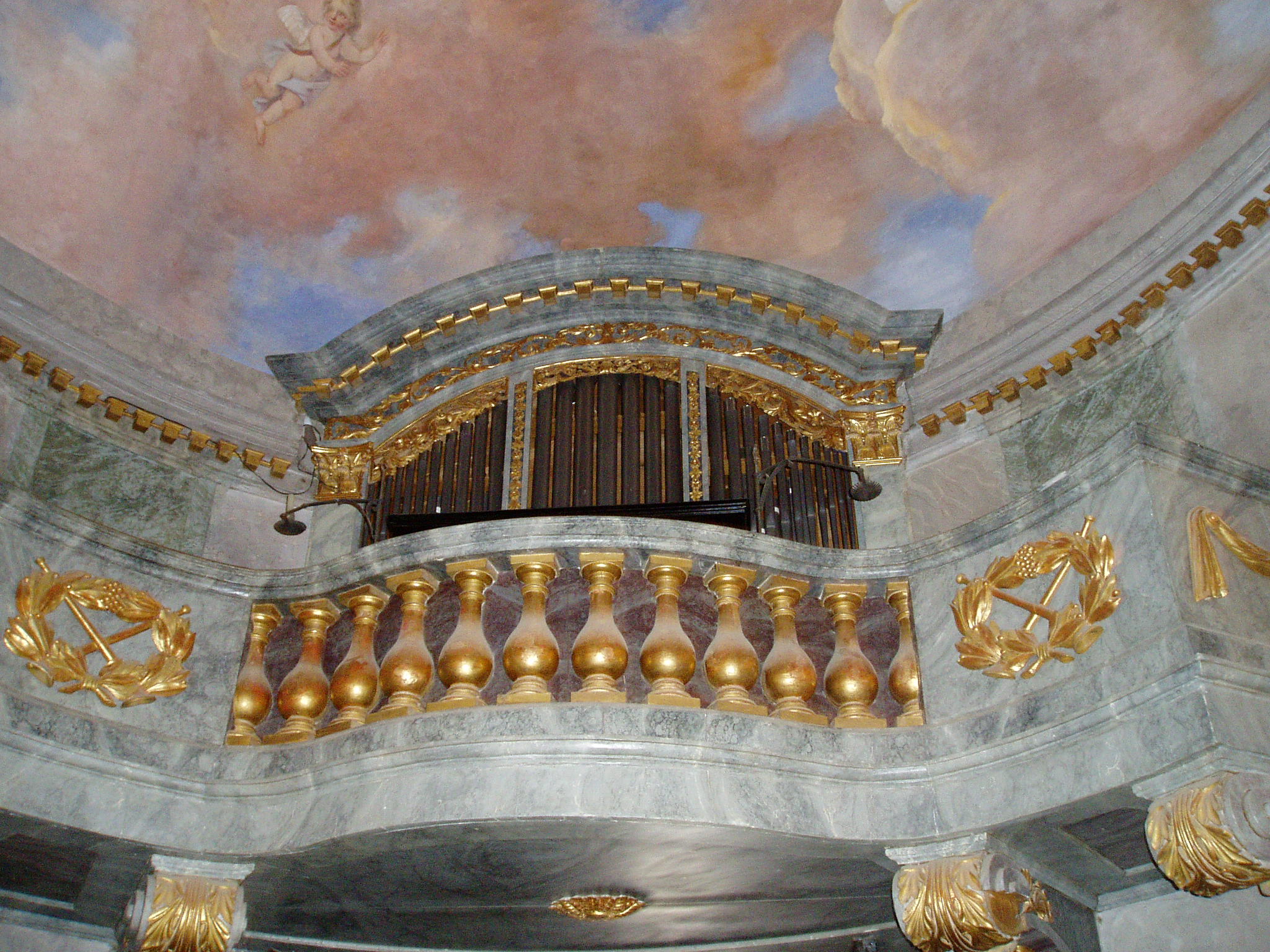 Nyilvános 1213 | 3077 | Nagycenk, Mauzóleum: orgonakarzat | A Széchényi család nyughelyét a temető létesítésével egyidőben Széchényi Ferenc építtette 1778-ban. A barokk stílusú sírkápolnát 1806-10 között klasszicista előtérrel bővítették. A téglalap alakú előcsarnok kazettás mennyezetét ion oszlopok tartják. Az ovális alaprajzú kápolnát kupola fedi, több kutató véleménye szerint Dorffmeister István freskóival. Innen jutunk a kriptába, a család számos jeles tagjának végső nyughelyére. A fénykép 2005 júliusában készült. Felh. irod.: Látnivalók Győr-Moson-Sopron megyében. Miskolc, Well-PRess, 2000 |