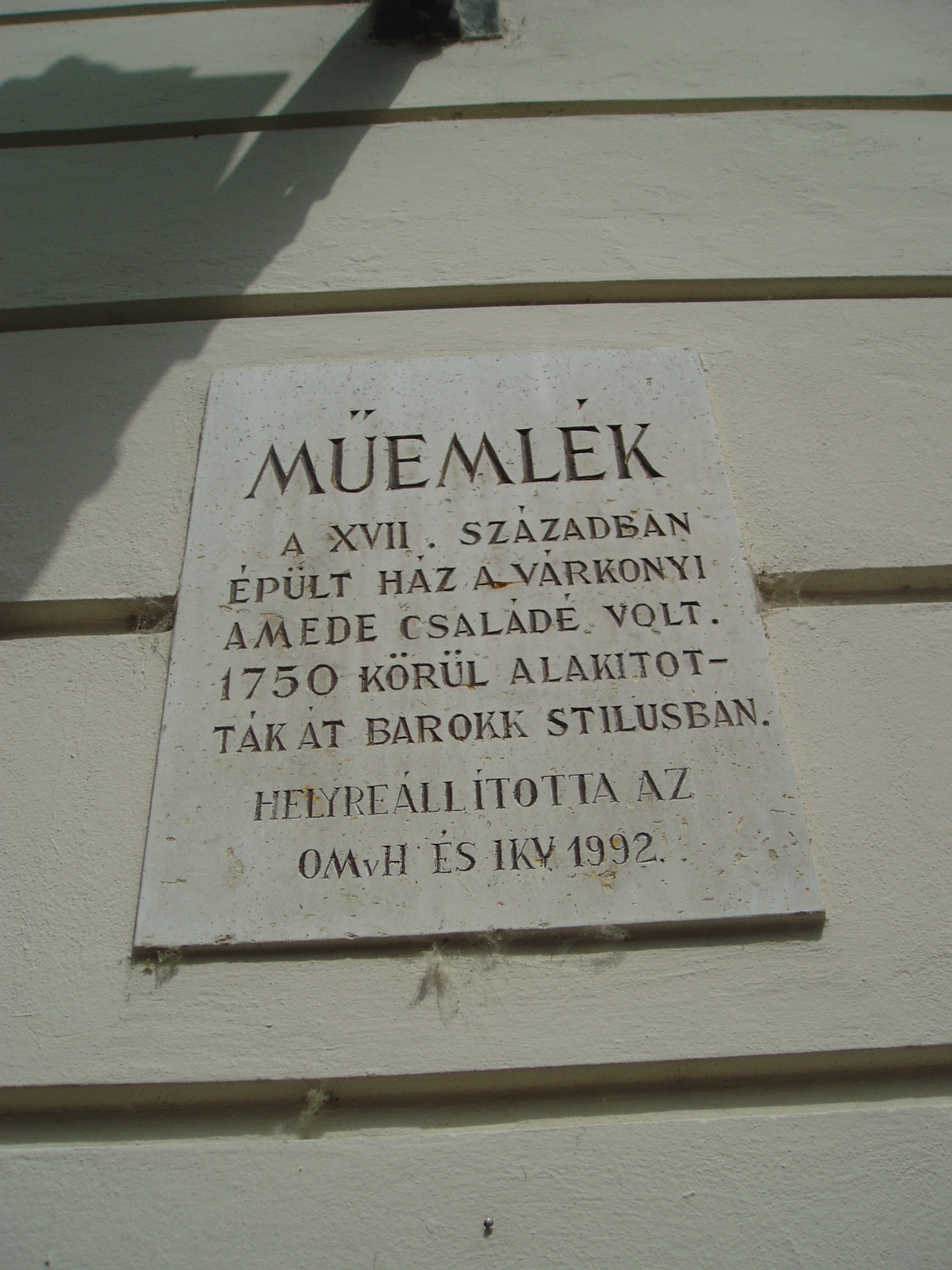 Nyilvános 1180 | 1631 | Győr, Bécsi kapu tér 4. | Európa legszebb barokk terei egyike a győri Bécsi kapu tér, amely nevét az 1860-ban lebontott nagytömegű, olaszos stílusú városkapuról kapta. A 4. számú épület a XVII. században épült, a rajta lévő műemléki tábla szerint a várkonyi Amede családé volt. Egy másik emléktábla arról tudósítja a sétálót, hogy ebben a házban élte át a város 1945-ös ostromát Borsos Miklós (1906-1990) szobrászművész, aki 1922 és 1947 között Győrben élt és alkotott (lásd még: Győr, Apor Vilmos püspök tere 2.). A felvétel 2008 május végén készült. Felh. irod.: Cziglényi László: Győr. Bp. Panoráma, 1981 |