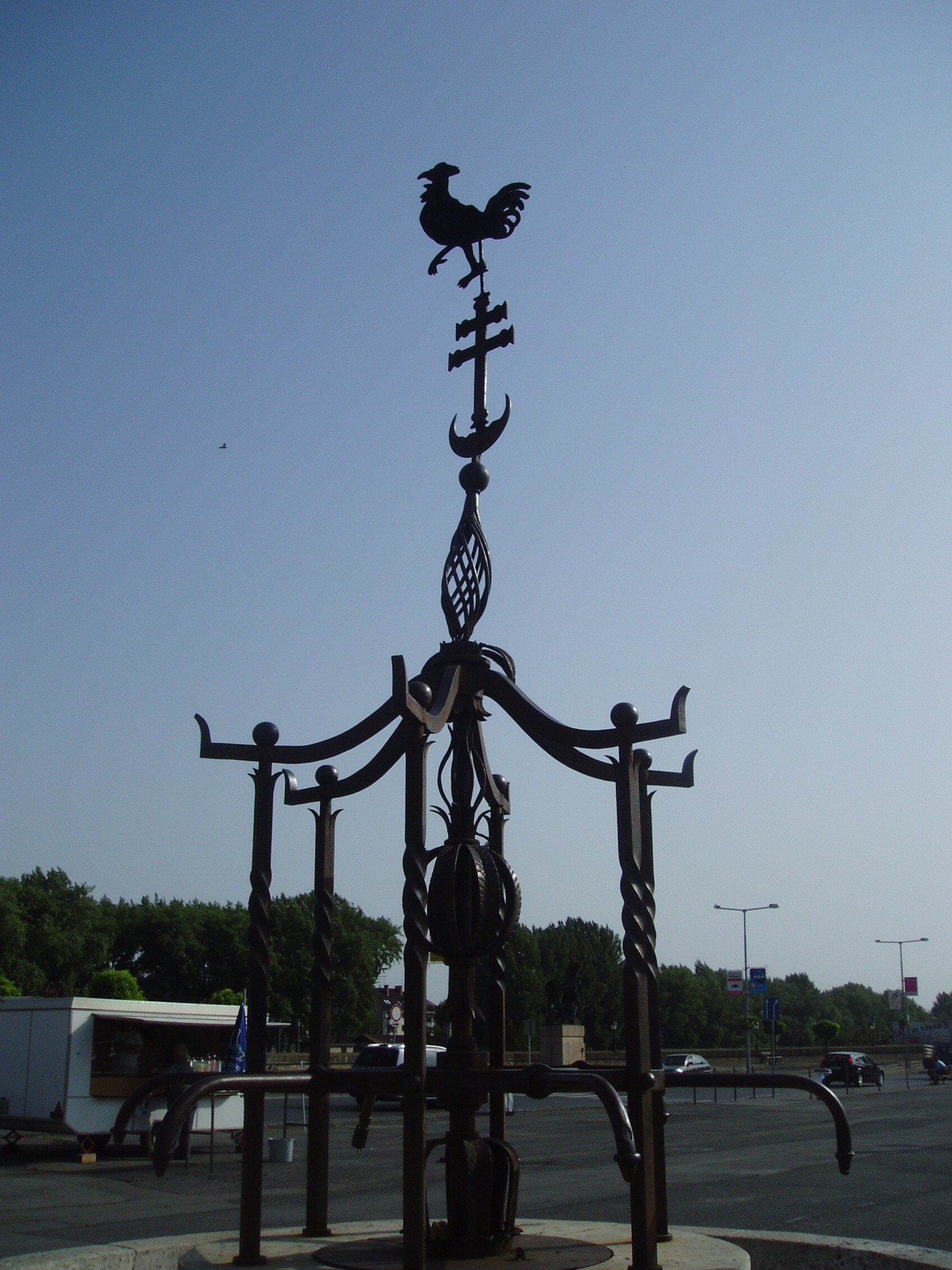 Nyilvános 1217 | 4163 | Győr, Dunakapu tér: Vaskakas | A Dunakapu tér közepe táján lévő díszkút tetejét a győri vaskakas másolata őrzi. A város jelképének is tartott madár eredeti példánya, amely ma a múzeumban látható, voltaképpen egy vörösréz lemezből kivágott szélkakas, amely a már nem létező Dunakapu építményét koronázta. Hozzá Győr várának a töröktől való 1598-as visszafoglalásához kapcsolódó legenda fűződik, amelynek forrása egy korabeli, Bécsben megjelent népének. E szerint a török dölyfösségében a Vízi-kapura aranyozott kakast helyezett el, és azt mondta, akkor űzik ki őket Győrből, amikor ez a kakas kukorékolni fog. A hagyomány szerint a vár visszafoglalásakor az érckakas az erős szélviharban valóban megszólalt... A felvétel 2008 május végén készült. Felh. irod.: Cziglényi László: Győr. Bp. Panoráma, 1981 |
