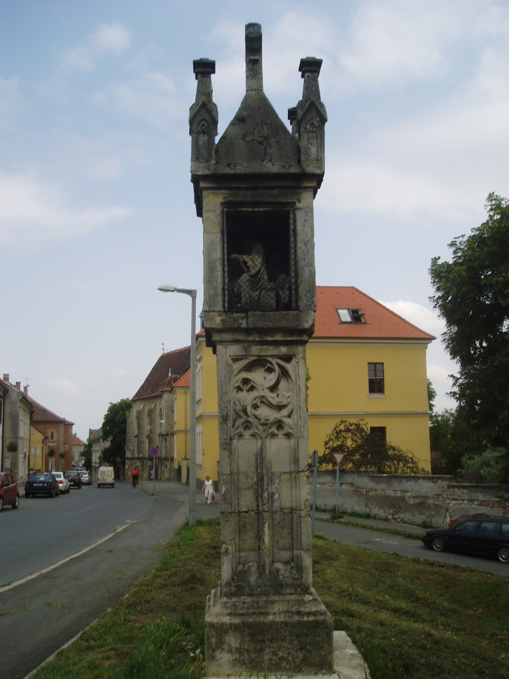 Nyilvános 1138 | 2339 | Sopron, Bécsi út: Lénárt-kereszt | A középkori eredetű, gótikus alkotás a Bécsi út és a Szélmalom utca sarkán áll. A XV. században készült, s akkor a Pócsi kapu közelében állt, a városfal mellett. Innen 1885-ben a Kuruc-domb aljába került, mostani helyére az 1930-as években hozták. Széles talapzaton álló, kőráccsal díszített magas pilléren szögletes tabernákulum áll, benne Szent Lénárt szobra. Kősisakjának fiatornyai és keresztje neeogótikus. A fénykép 2008 júniusában készült. Felh. irod.: Czellár Katalin: Sopron. 3. jav. kiad. Bp. Panoráma, 2000 |