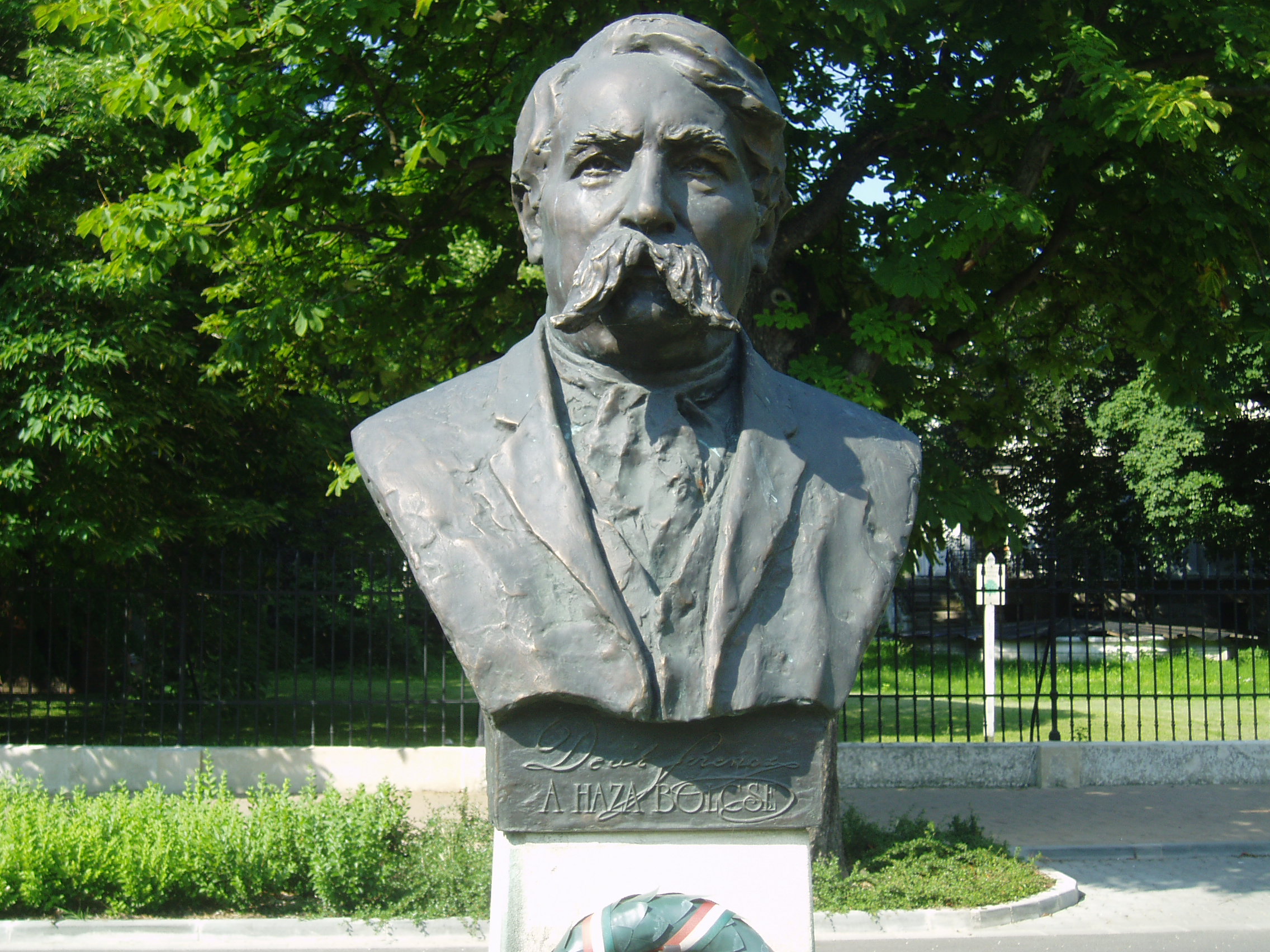 Nyilvános 1165 | 2412 | Sopron, Deák tér | Sopron leghosszabb terét az itt folyó Rák patak beboltozásával alakították ki s reprezentatív kialakítású, historizáló stílusú épületek veszik körül. A téren első és második világháborús emlékművek mellett a névadóra, Deák Ferencre is szobor emlékeztet. Kutas Ferenc alkotását 2003-ban avatták fel. A fénykép 2008 júniusában készült. |