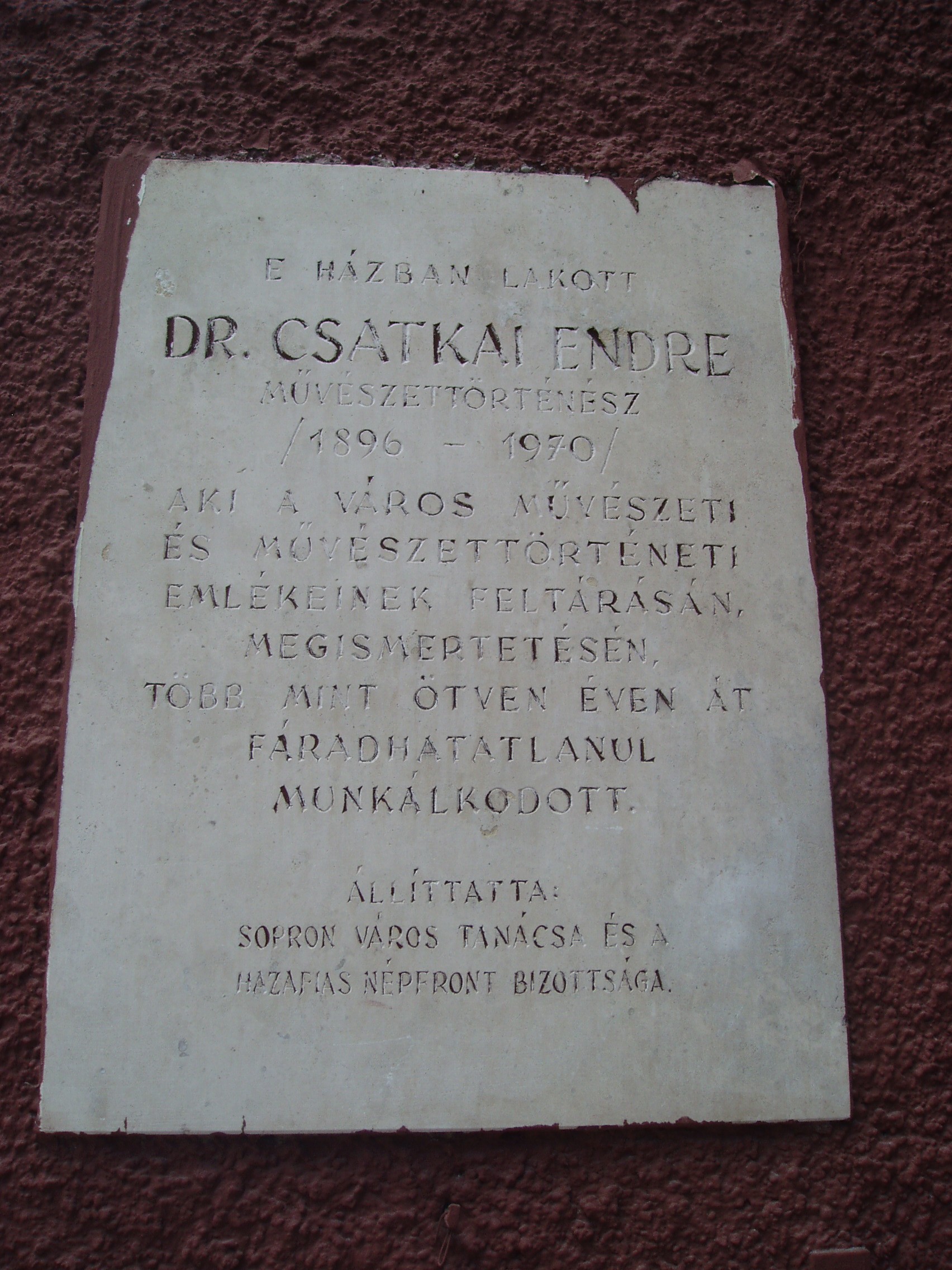 Nyilvános 1127 | 1626 | Sopron, Előkapu 10. | Sopron belvárosának főbejárata az északon nyíló Előkapu. Helye már a római korban lakott volt, majd a középkorban erődítésrendszert alakítottak itt ki. A területet a XVIII. század közepétől kezdték beépíteni lakóházakkal. Az itt álló, fűrészfogasan kialakított lakóépületek az egykori erődítés vonalát követik. Mint emléktáblája is tanúsítja, ebben a házban élt Csatkai Endre (1896-1970) művészettörténész, aki Sopron művészeti és művészettörténeti emlékeinek feltárásán, megismertetésén több, mint ötven éven át munkálkodott. Neve és munkássága megkerülhetetlen a Sopronnal ismerkedőknek. A fénykép 2008 júniusában készült. Felh. irod.: Czellár Katalin: Sopron. 3. jav. kiad. Bp. Panoráma, 2000 |