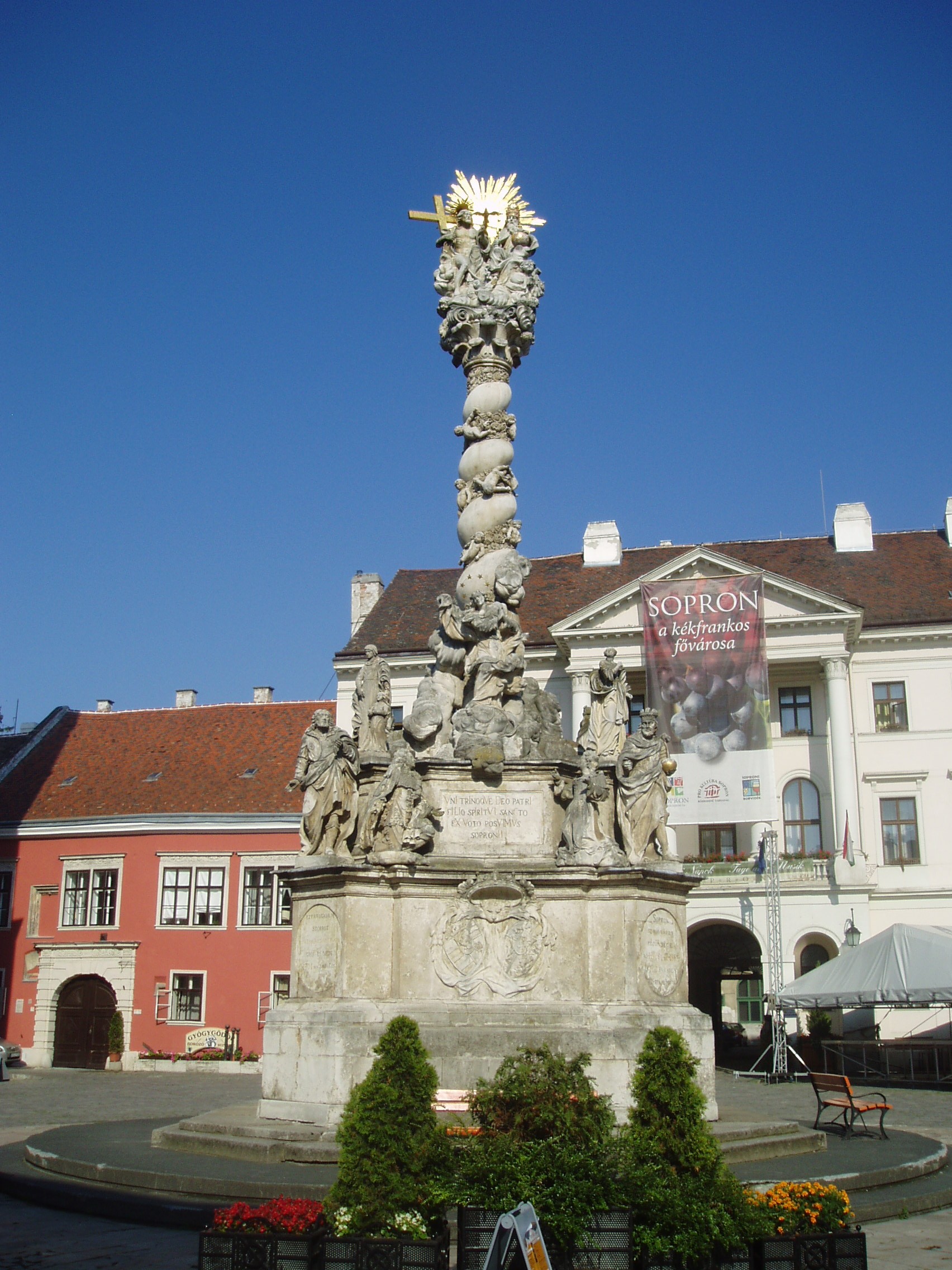 Nyilvános 891 | 1198 | Sopron, Fő tér: Szentháromság oszlop | A Fő téren áll a Szentháromság szobor, amely a magyarországi barokk szobrászat egyik legkiemelkedőbb alkotása. 1695 és 1701 között készült Thököly Katalin és harmadik férje, Löwenburg Jakab alapítványából. Az évszázadok során többször restaurálták. Talapzata három, egymásra állított, íves oldalú négyzetes hasábból áll. A másodikon az adományozó házaspár, valamint négy szent alakja helyezkedik el. Felhőcsomókon emelkedik a korinthoszi fejezetes csavart oszlop, amelyet virágfüzérek közt lebegő angyalkák díszítenek. Az oszlopfőt a Szentháromság csoportja koronázza. Az oszlop aljánál Immaculata-szobor és szentek alakjai állnak. A fénykép 2008 júniusában készült. Felh. irod.: Czellár Katalin: Sopron. 3. jav. kiad. Bp. Panoráma, 2000 |