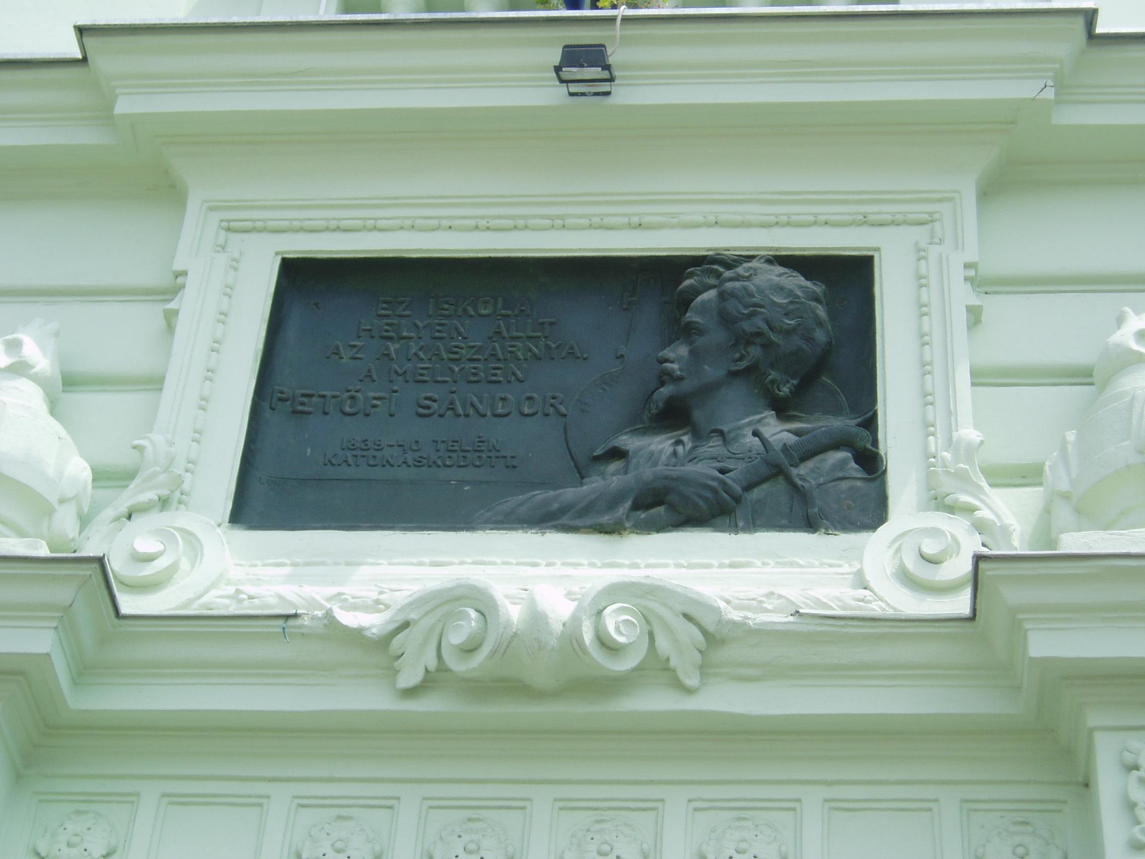 Nyilvános 1073 | 1536 | Sopron, Halász utca 25. | A Petőfi Sándor Általános Iskola falán emléktábla hirdeti, hogy valaha helyén az a kaszárnya állt, amelyben 1839/40 telén katonáskodott Petőfi Sándor. A fénykép 2008 júniusában készült. |