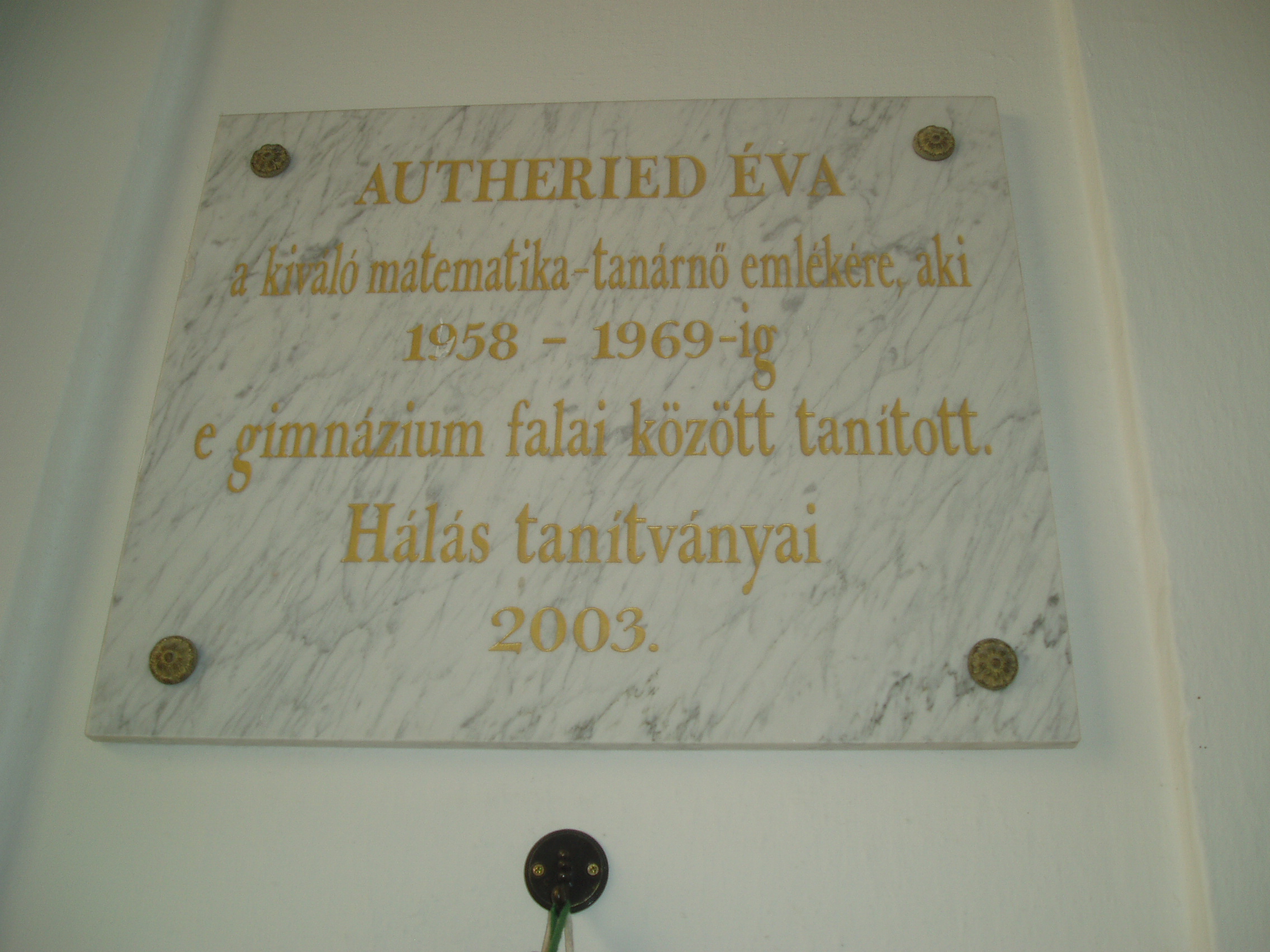 Nyilvános 1092 | 1861 | Sopron, Liszt Ferenc utca 1. | A Széchenyi István Gimnázium eredetileg reáliskola volt, amelyet 1850-ben alapítottak (lásd: Liszt Ferenc utca 2.). A Liszt Ferenc utca sarkán álló épületrészét, amelynek ezen a képen az udvari része látható, 1872-ben építették. Az épületen több tanár emlékét is feliratos tábla hirdeti. A képen láthatót Autheried Éva matematika szakos tanár eemlékére állították, aki 1958-1969 között volt a gimnázium tanára. A fénykép 2008 júniusában készült. Felh. irod.: http://szig.sopron.hu/ |