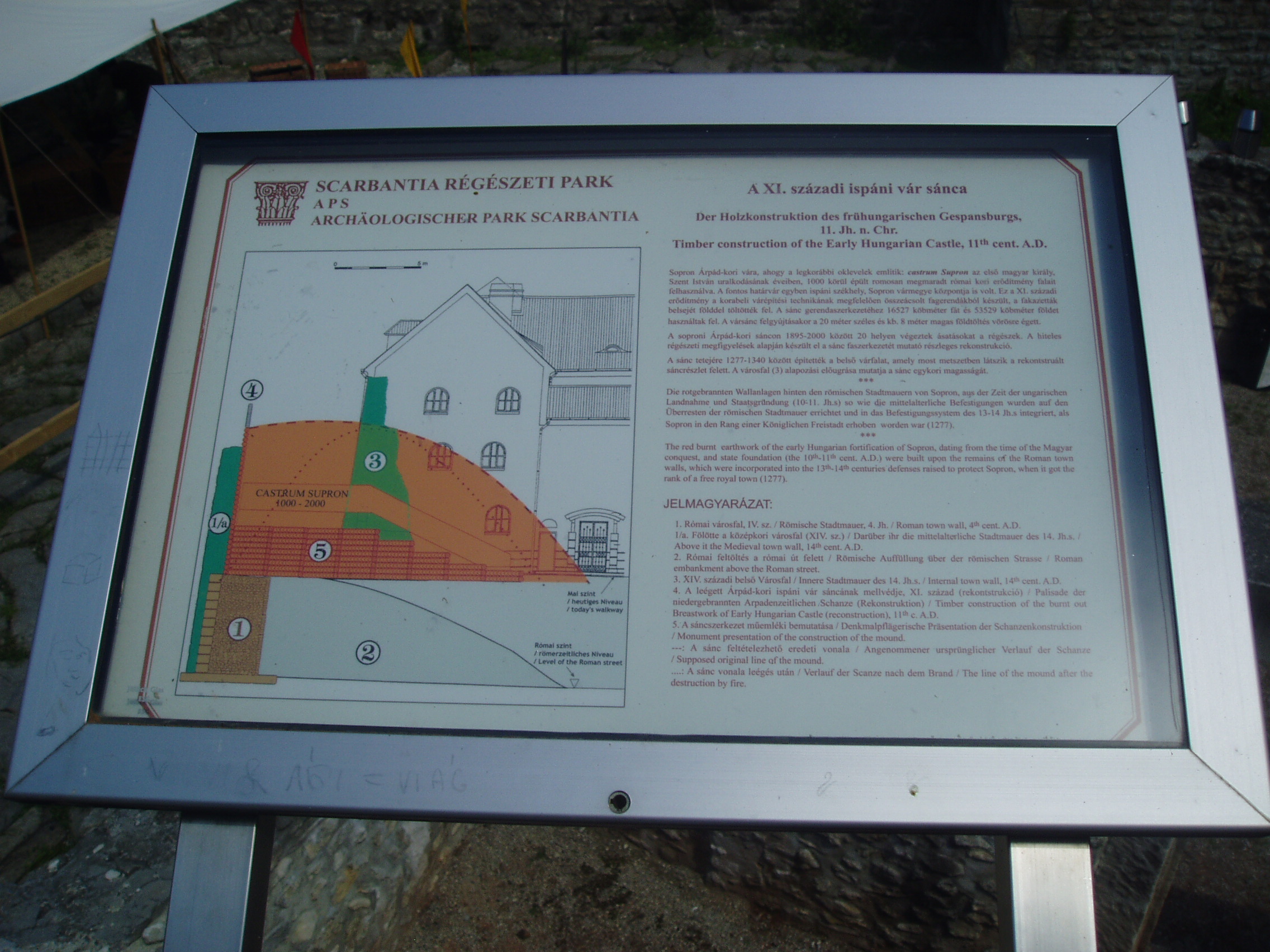 Nyilvános 1074 | 1373 | Sopron, Scarbantia Régészeti Park | Az egykori Római Birodalom Pannónia provinciájának egyik határállomása Scarbantia, a mai Sopron volt. A római oppidum központjának, a fórumnak legfontosabb épületét - a capitoliumi templomot - 1893 telén a városháza építésekor találták meg. Az 1960- és 1970-es évek ásatásaival végül sikerült meghatározni a fórum teljes kiterjedését és elhelyezkedését. A mai belváros szívében feltárt maradványokat - kiegészítve a a XI. századi ispáni vár feltárt sáncával - nagyszabású szabadtéri régészeti kiállítás keretében, térképekkel, ismertetőszövegekkel kellően ellátva szemlélheti meg a városnéző. A kép 2008 júniusában készült. |