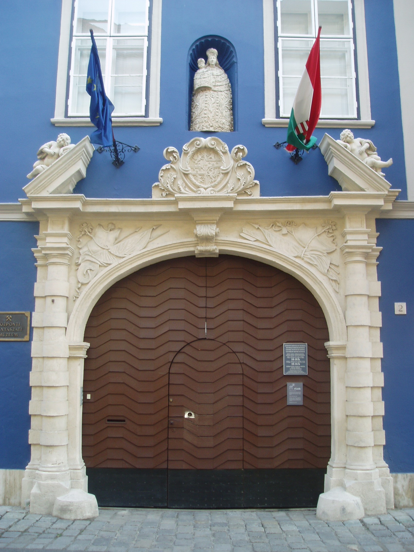Nyilvános 1125 | 1465 | Sopron, Templom utca 2. Esterházy-palota | Az egyemeletes barokk Esterházy–palota eredete a XV. századig nyúlik vissza. 1752-ben Esterházy Pál Antal vette meg, s homlokzatát ezután alakították át a mellette levő (Templom u. 4.) régebbi Esterházy–palota mintájára; az épület udvari része azonban megtartotta a XVII. századbeli formákat. Homlokzatán a kapu feletti ablakok közötti félkör alakú fülkében a máriacelli kegyszobor kőmásolata, alatta az Estreházy-címer látható. A XVII. században ebben a házban lakott Rauch András (1592–1656), az evangélikusok karnagya, jeles zeneszerző, akit napjainkban kezdenek újra felfedezni. Az épület ma a Központi Bányászati Múzeum otthona. Bástyakertje nyáron kosztümös barokk hangversenyek színhelye. A kép 2008 júniusában készült. Felh. irod.: Czellár Katalin: Sopron. 3. jav. kiad. Bp. Panoráma, 2000 |