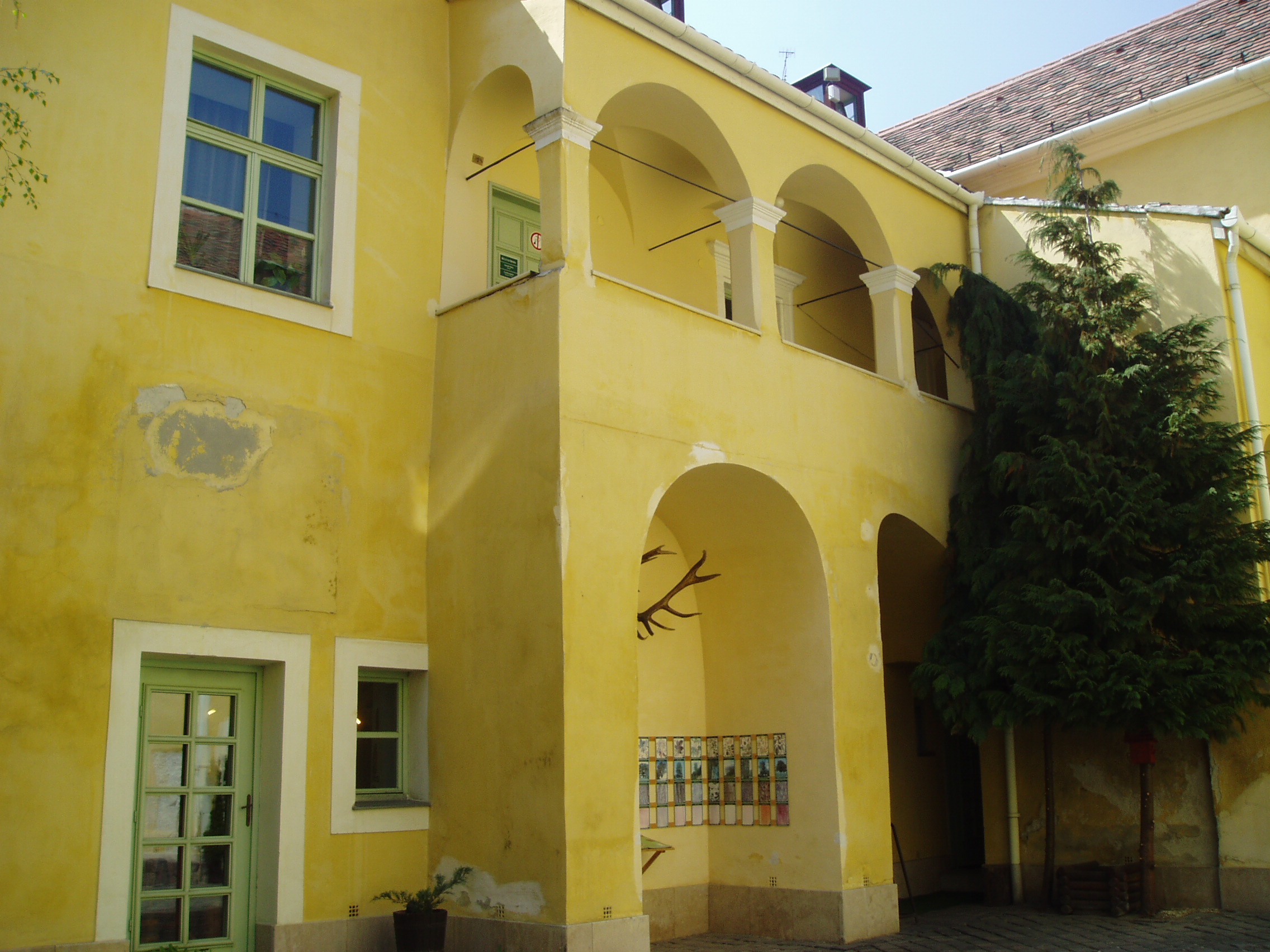 Nyilvános 1050 | 1388 | Sopron, Templom utca 4. Esterházy-palota | A Templom utca 2. számú házhoz hasonlóan ez a középkori eredetű épület is az Esterházy család tulajdona volt 1614-től egészen 1945-ig, előtte pedig Oláh Miklós, a neves humanista érsek családjáé volt. A XVII. századból a kapu és az udvari loggia őrződött meg; homlokzata, amely mintegy folytatása a másik Esterházy–palotának, a XVIII. század közepéről származik. Ebben az épületben állapították meg 1921-ben az antanthatalmak megbízottjai a Sopron és környékének sorsát eldöntő népszavazás eredményét. Az evangélikus templom harangozója hallotta meg elsőként a polgárok közül a jó hírt, s ő kezdte el örömében a harangozást, amihez azután Sopron többi temploma is csatlakozott. A kép 2008 júniusában készült. Felh. irod.: Czellár Katalin: Sopron. 3. jav. kiad. Bp. Panoráma, 2000 |