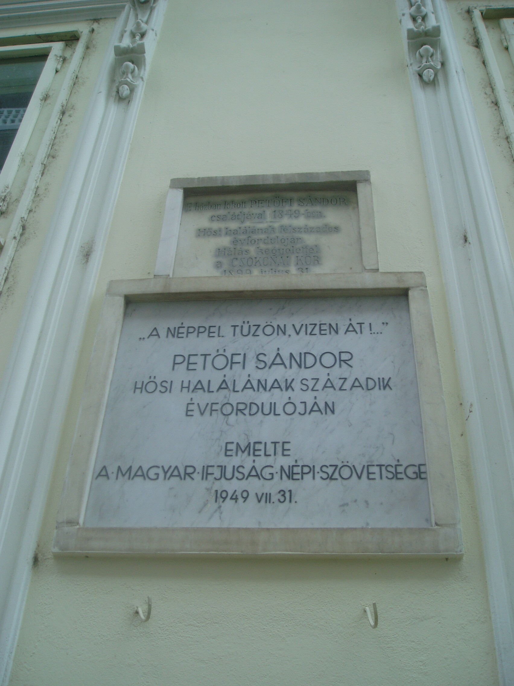 Nyilvános 1515 | 3477 | Rövid leírás | Teljes leírás (1.48 KB) | Debrecen, Batthyány utca 16. Ebben a házban lakott Petőfi Sándor gyermeküket váró fiatal feleségével 1848/49 telén, Ormós Gábor szabómesteréknél. Itt született meg 1848. december 15-én fia, Zoltán. A nagy eseményről a költő így számolt be: "Született Zoltán fiam december 15-én 1848. déli tizenkét órakor, Debrecenben, a Harmincad utcában, az utcára nyíló kapu melletti szobában... Azaz jobban mondva: pénteki napon és ami több, Debrecenben!" Visszagondolva 1843/44 telére, amit rendkívül nyomorúságos körülmények között töltött Debrecenben, nem csoda, hogy a város nem a legjobb emlékeket hagyta a költőben. A szobában, amely az utcára nyíló kapu mellett található, ma utazási iroda van... Petőfi harcra buzdító, nagyhatású költemények egész sorát írta ebben a házban: Akasszátok fel a királyokat, Itt a nyilam, mibe lőjem, Az egész világ a harcmezőn, Európa csendes, újra csendes... és más költeményeit. Innen indult a harctérre, Bem tábornokhoz, hogy aztán már csak egy-egy napra, futó látogatásra térjen vissza családja körébe A ház homlokzatán több emléktábla is idézi az történteket. A fénykép 2006 júniusában készült. Felh. irod.: Kovács Gergelyné: Debrecen. Bp. Panoráma, 1981 Papp Antal: Debrecen. Bp. Panoráma, 1976 Petőfi emlékhelyek a Kárpát-medencében. Kiskőrös, 1996 |