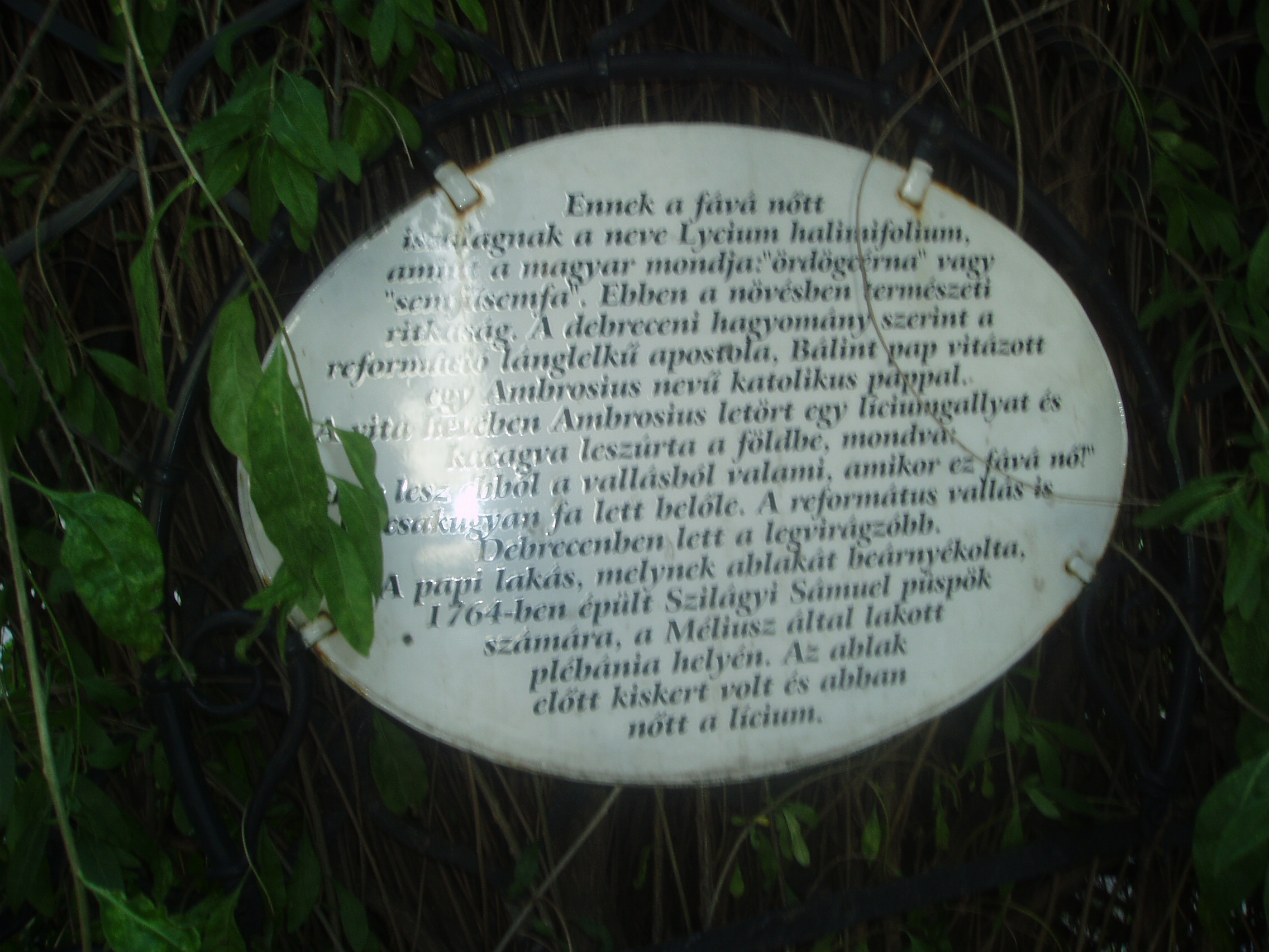 Nyilvános 1127 | 1635 | Debrecen, Hatvan utca 1. Líciumfa | A Nagytemplom háta mögött zöldellő Emlékkert nyugati oldalánál található a fává nőtt líciumtő (semfű-semfa, hivatalos nevén lycium halimofolium). A növény ebben az alakjában botanikai ritkaság, mert általában bokorként, cserjeként ismeretes. A líciumfához egy sokat emlegetett művelődéstörténeti anekdota fűződik (aminek a botanikusok szerint nincs valós alapja): A XVI. században Debrecen városának a reformáció útjára való áttérését megindító Bálint pap a katolikus Ambrosius mesterrel heves vitában sétált itt, az egykori öreg plébánia előtti úton. Kezében egy letört líciumágat tartott és azzal gesztikulált, hogy nagyobb nyomatékot adjon szavainak. Ambrosius mester makacsul hangoztatta, hogy sohasem lesz vallás abból, amit Kálvin tanít. "Akkor lesz ebből vallás - kiáltotta indulatosan -, mikor a lycium fává nő." "Hát akkor fa lesz belőle!" - válaszolta Bálint pap, és lábai előtt a földbe szúrta a líciumágat. S az igénytelen kis gallyacska megfogant s fává terebélyesedett, ágaival befonta a plébánia vasrácsos ablakrostélyát. Mikor évszázadok múlva sor került az öreg épület lebontására, a legendává nőtt líciumfát az ablakrostéllyal együtt érintetlenül hagyták, s ma is ebben az állapotában látható. A fénykép 2006 júniusában készült. Felh. irod.: Papp Antal: Debrecen. Bp. Panoráma, 1976 Kovács Gergelyné: Debrecen. Bp. Panoráma, 1981 |