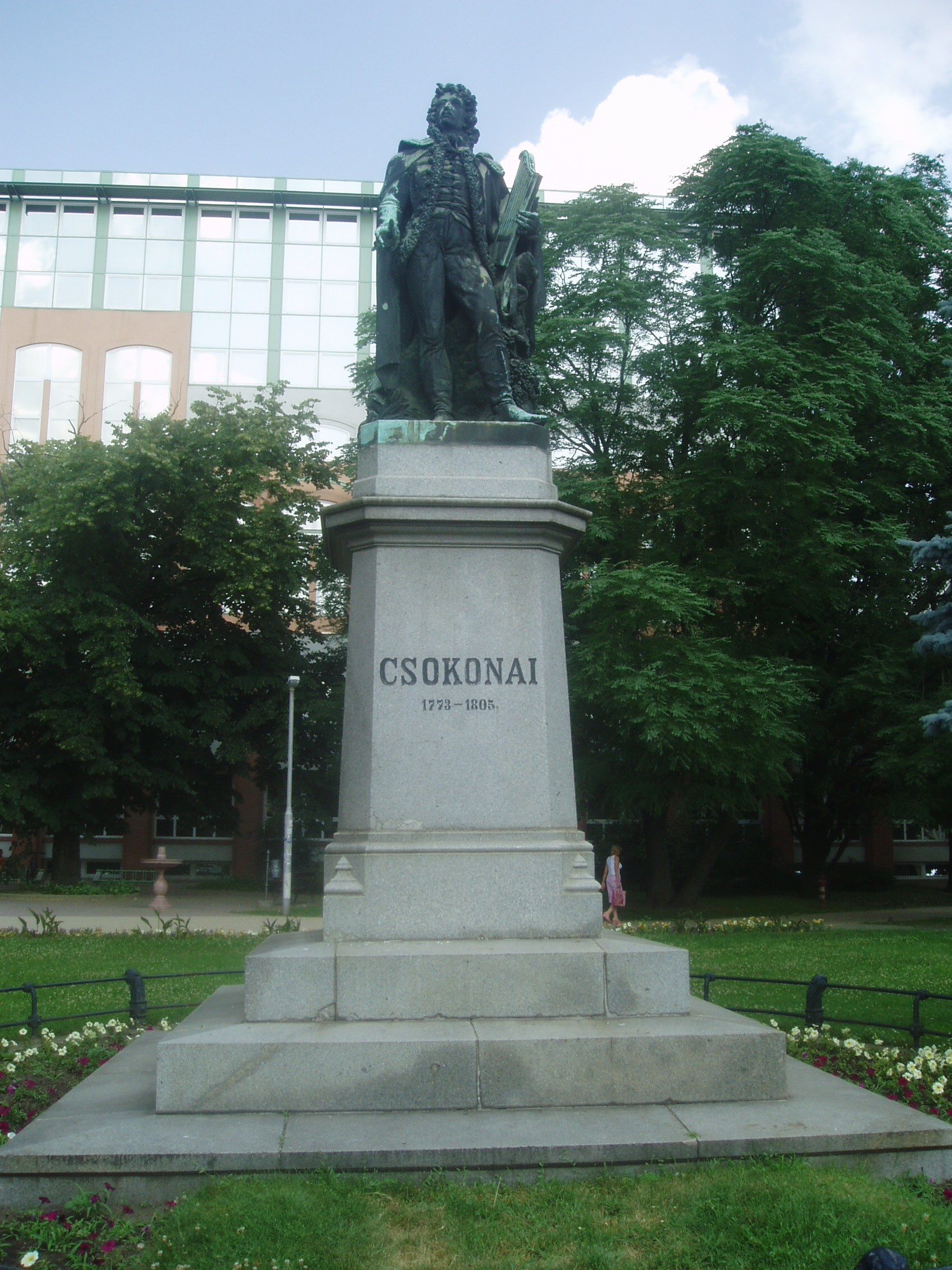 Nyilvános 1266 | 2124 | Debrecen, Kálvin tér: Csokonai Vitéz Mihály szobra | A Kálvin tér ékessége Izsó Miklós Csokonai Vitéz Mihályt ábrázoló, 1867-ben készült romantikus szobra. A magas márvány talapzaton álló és arccal a Kollégium felé tekintő szobor szakértői vélemények szerint az egyik legszebb köztéri szobor Magyarországon. A szobor magyaros ruhában, zsinóros mentében, lanttal a kezében, szőlőtőke mellett jeleníti meg az anakreoni dalok költőjét, mintegy az ihlet pillanatában. A művész eredetileg vékonyabb testalkatúnak mintázta Csokonait (ez a gipszvázlat a Kollégiumban található), de a terv nem nyerte el a debreceni cívisek tetszését, mondván, hogy ilyen sovány ember nem élhetett Debrecenben... A fénykép 2006 júniusában készült. Felh. irod.: Papp Antal: Debrecen. Bp. Panoráma, 1976 Kovács Gergelyné: Debrecen. Bp. Panoráma, 1981 |