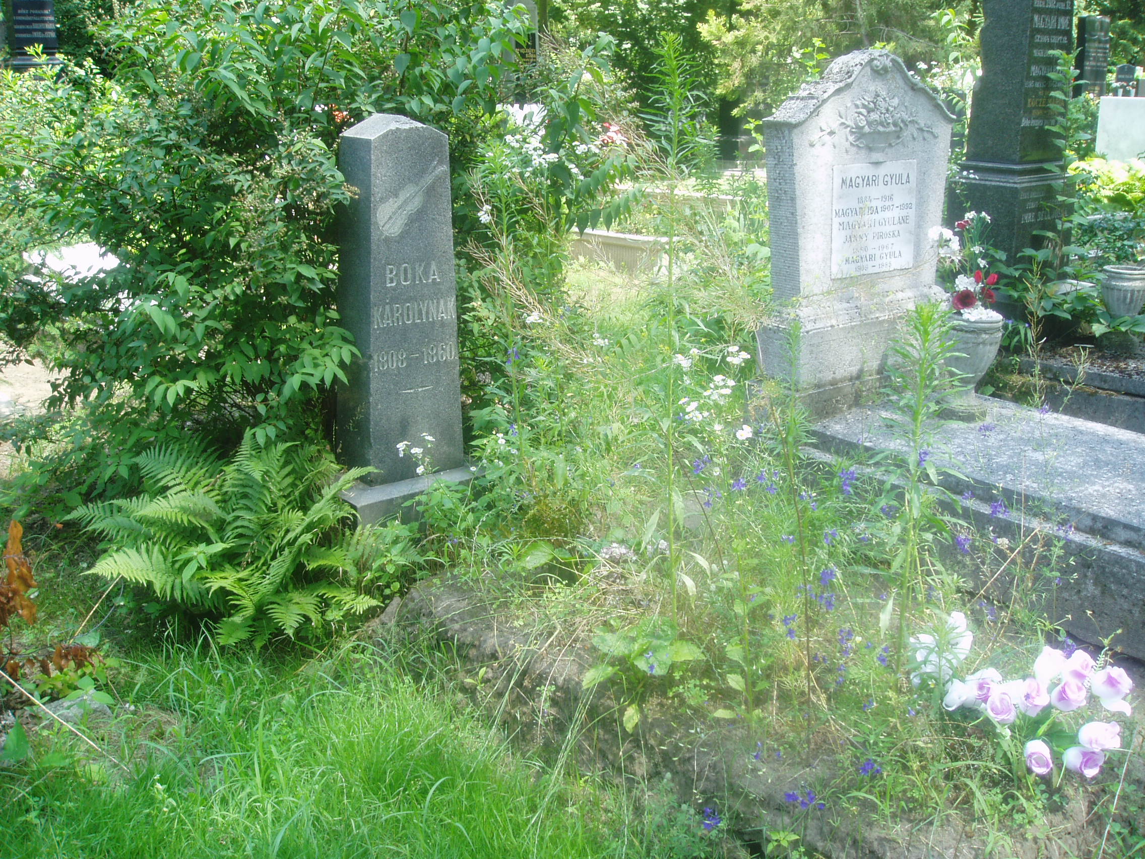 Nyilvános 1625 | 5148 | Debrecen, Bocskai út: Köztemető. Boka Károly sírja | Debrecen új köztemetőjét 1932-36 között alakították ki. A temetőkertet és a nagy művészettörténeti értéket képviselő ravatalozó épületét Borsos József tervezte. Itt nyugszik Boka Károly (1808–1860), Debrecen híres prímása, az „alföldi cigánykirály”. Hamvait 1945 után, a régi temető felszámolásakor szállították ide. Boka régi debreceni cigánydinasztia sarja volt, zenei tehetsége nagyon korán kibontakozott. Alig töltötte be tizenhatodik évét, amikor a városban húsz–huszonnégy tagú zenekarával nem mindennapi népszerűségre tett szert, s a debreceni országos vásárokra sereglő emberek más vidékekre is elvitték nevét. Az Aranybikában muzsikáló zenész ezreket keresett vonójával, szőlője volt a város határában és értékes háza a Várad utcában. A városi tanács 1846-ban felvette a város polgárainak sorába, ami óriási elismerésnek számított a büszke városban. Talán az egyetlen cigány volt, akit az urak nem tegeztek. Ő volt az, aki 1849 nyarán, a vesztes debreceni csata után az orosz vezérkar bevonulásakor Paskievics parancsára, miszerint a város lakossága zeneszóval ünnepelje meg az eseményt, a „Megvirrad még valaha, nem lesz mindig éjszaka” című dalt kezdte játszani… Temetésekor koporsóját díszruhás hajdúk kísérték, akiket a városlakók ezrei követtek hosszú sorban. Debrecen összes zenekara az ő szerzeményeiből játszott, a szertartáson a Kollégiumi Kántus énekelt. Boka számos ma is népszerű dal szerzője volt (Káka tövén költ a ruca, Édesanyám is volt nékem, Feketeszárú cseresznye, Debrecenbe kéne menni). A fénykép 2006 júniusában készült. Felh. irod.: Kovács Gergelyné: Debrecen. Bp. Panoráma, 1981 Nyakas László: Boka Károly, az alföldi cigánykirály. = Honismeret 1987. 2. |