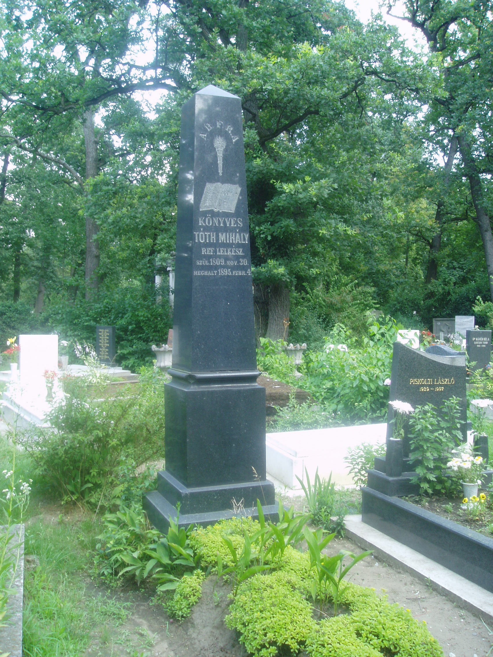 Nyilvános 1541 | 3900 | Debrecen, Bocskai út, Köztemető: Könyves Tóth Mihály sírja | Debrecen új köztemetőjét 1932-36 között alakították ki. A temetőkertet és a nagy művészettörténeti értéket képviselő ravatalozó épületét Borsos József tervezte. A díszsírhelyek a főbejárattól jobbra helyezkednek el. Itt nyugszik a magyar művelődástörténet számos nagy alakja, akiknek földi maradványait áthozták a többnyire felszámolt régi temetőkből. Itt nyugszik Könyves Tóth Mihály (Debrecen, 1809. nov. 30. – Debrecen, 1895. febr. 4.) református lelkész. 1836-tól debreceni prédikátor. A szabadságharc idején buzdító beszédeket mondott, sőt az aradi táborban is jelen volt. Ezért előbb halálra, majd húsz év várfogságra ítélték. 1856-ban kiszabadult, de hosszú ideig tilos volt lelkészi és tanítói állást elfoglalnia. 1863-tól Karcagon, 1871-től Debrecenben papként működött. Jó szónok volt, több prédikációja és halotti beszéde nyomtatásban is megjelent. (Lásd még: Debrecen, Széchenyi u. 4.) A fénykép 2006 júniusában készült. Felh. irod.: Kovács Gergelyné: Debrecen. Bp. Panoráma, 1981 Magyar életrajzi lexikon |