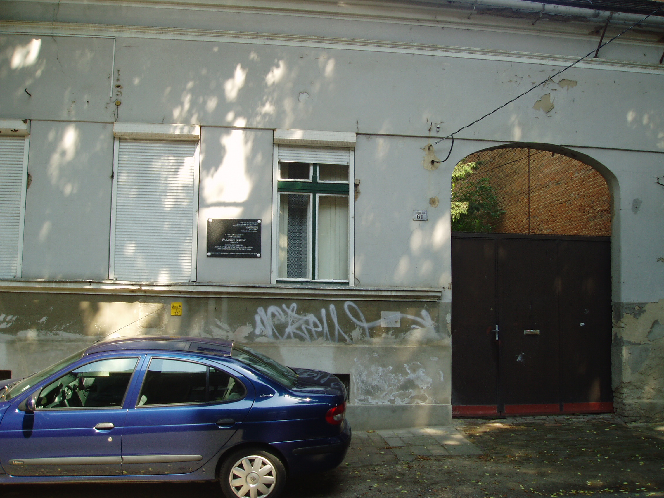Nyilvános 1192 | 1699 | Debrecen, Darabos utca 61. | Mint az épületen elhelyezett fekete márványtáblán olvasható, ebben a házban élt és alkotott Pákozdy Ferenc (1904-1970) költő, műfordító, az Egyetemi Könyvtár munkatársa. Orvosnak készült, majd jogot hallgatott, jog- és államtudományi doktorátust szerzett. 1928–1944 között újságíró volt különböző lapoknál. 1945 után szülővárosában, Hódmezővásárhelyen dolgozott. 1952-től élt Debrecenben. A harmincas években József Attila pártfogója és értő kritikusa volt, költészete mellett a Külvárosi éj című verséről írott recenziójában állt ki (megjelent a hódmezővásárhelyi Hétfői Újságban 1933. jan. 2.án). A fénykép 2006 júniusában készült. Felh. irod.: Magyar életrajzi lexikon |