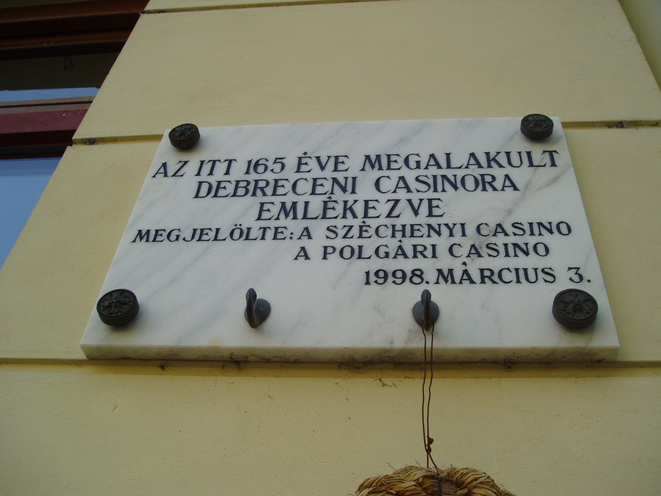 Nyilvános 1167 | 1762 | Debrecen, Piac utca 31. | Ennek a háznak az első emeletén alakult meg Debrecen első kaszinója 1833. márc. 30-án. 1849. ápr. 14-én este a trónfosztás (lásd: Debrecen, Kálvin tér) kimondása után ennek az épületnek azóta lebontott első emeleti erkélyéről beszélt Kossuth Lajos a néphez, amikor Könyves-Tóth Mihály lelkész a város közönsége nevében fáklyás-zenés felvonulás élén üdvözölte. Felh. irod.: Papp Antal: Debrecen. Bp. Panoráma, 1976 Kovács Gergelyné: Debrecen. Bp. Panoráma, 1981 |