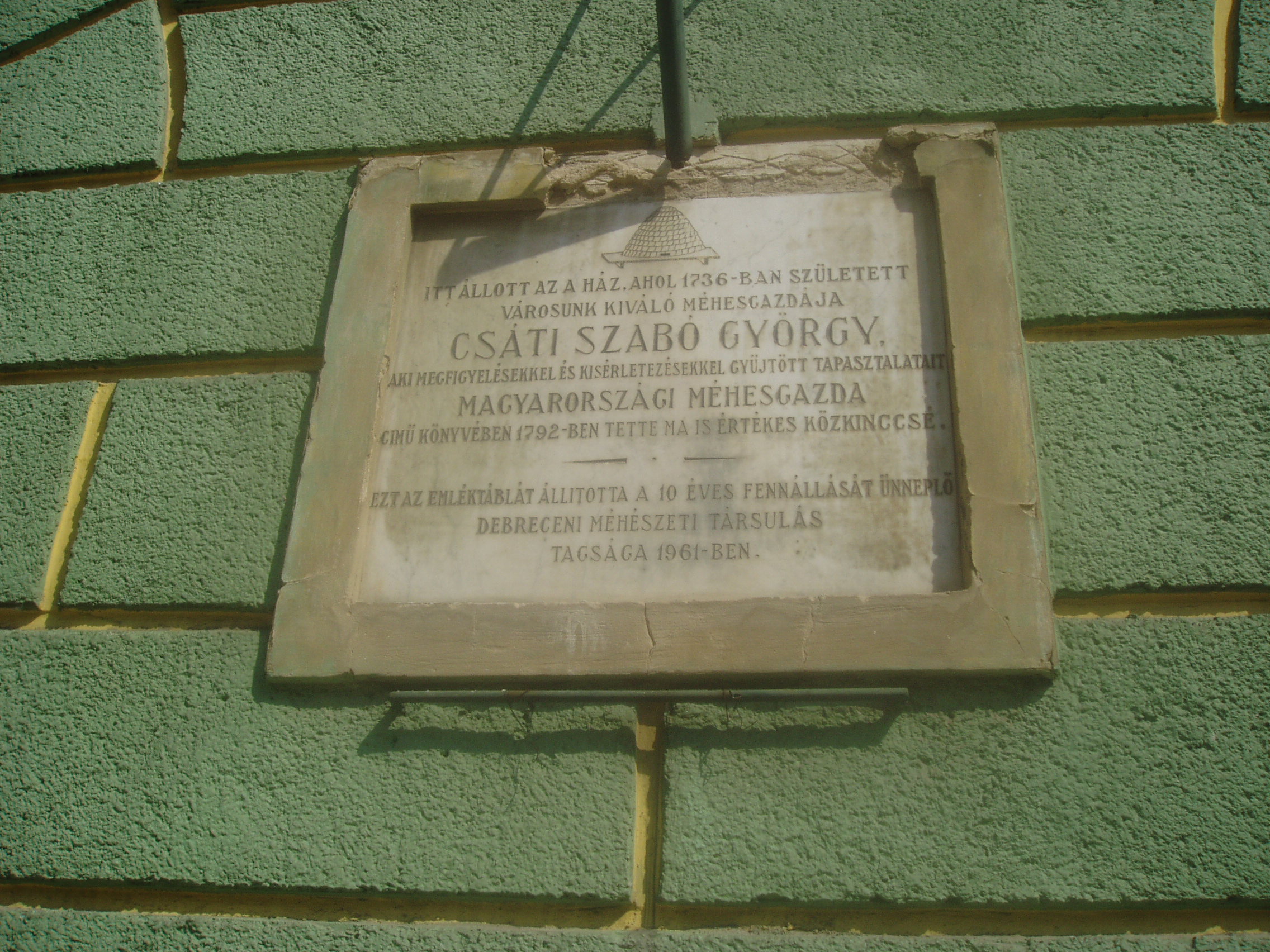 Nyilvános 1553 | 3381 | Debrecen, Csapó utca 1. | A mostani épületen emléktábla adja tudtul, hogy az egykor ezen a helyen állott házban született 1736-ban Csáti Szabó György, Debrecen kiváló méhesgazdája. A fénykép 2006 júniusában készült. |