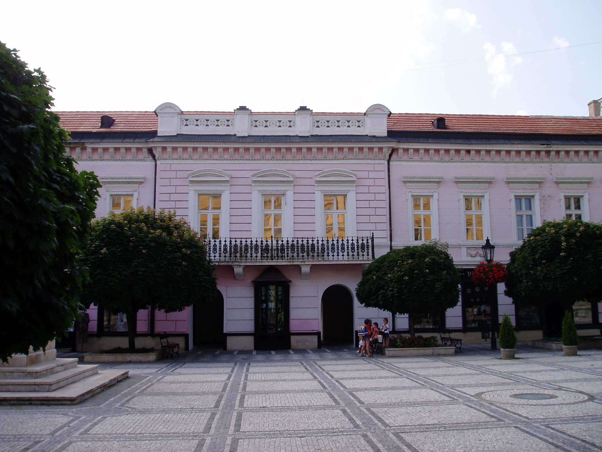 Nyilvános 1231 | 5298 | Komárom (Komárno). Klapka tér 9. Zichy-palota | A Klapka tér legnagyobb épülete a volt Zichy–palota. Zichy Miklós gróf, szabolcsi főispán építtette a XVII. század második felében. Eredetileg barokk stílusú volt, de miután a 1763-as nagy komáromi földrengés romba döntötte, klasszicista stílusban épült újjá, két épületszárnnyal bővülve. Udvarának végén az 1800-as évek elejétől 1827-ig emeletes épület állt, ennek emeleti részén tartották a táncmulatságokat és a színházi előadásokat. Az első hivatásos magyar színtársulat Komáromban Benke József és Kemény János vezetésével lépett fel 1811 májusában (ők a második pesti színtársulatból váltak ki). A társulatban ott volt Balogh István, Déry István, Láng Ádám, Murányi Zsigmond, Murányiné Lefèvre Teréz és a pályája legelején levő, tizennyolc éves Scheckenbach (Schenbach) Róza, aki később Déryné Széppataki Róza néven vált a magyar játékszín történetének állócsillagává. Legközelebb Balogh István székesfehérvári társulata jutott el Komáromba, valamikor 1813 és 1815 között. Szinnyei József szerint ennek a társulatnak Katona József is tagja volt, s Idegen művésznéven fellépett itt a Hamlet címszerepében és saját, Luca széke című darabjában. 1819 októberében Kilényi Dávid kecskeméti társulata érkezett a városba. Előadásaikról Ásvay Jókay József, Jókai Mór édesapja tudósított a helyi sajtóban. A közelmúltban a Zichy–palota udvarán építették ki az ún. Európa udvart. A helyi viszonylatban gigantikus méretű vállalkozás célja, hogy élőben mutassa be harmincöt európai ország építészetét. A városrész egyben Komárom új szolgáltató központja is, üzletekkel, éttermekkel, kávézókkal, valamint egy föld alatti bevásárlóközponttal. A palota első emeletén (bejárat a Szentháromság–szobor melletti kapun) a város két híres szülötte, Jókai Mór és Lehár Ferenc emlékkiállítása látható. Különösen a Jókai-kiállítás gazdag eredeti relikviákban. A fénykép 2005. júliusában készült. Felh.irod.: www.komarno.sk Mácza Mihály: Komárom nevezetességei. Pozsony, Madách-Posonium, 2002 Szénássy Zoltán: Rév–Komárom. KT Kiadó, 1998 Tóth László: "...miként hajdan az apostolok" : a komáromi magyar színjátszás története. Dunaszerdahely, Lilium Aurum, 1997 |