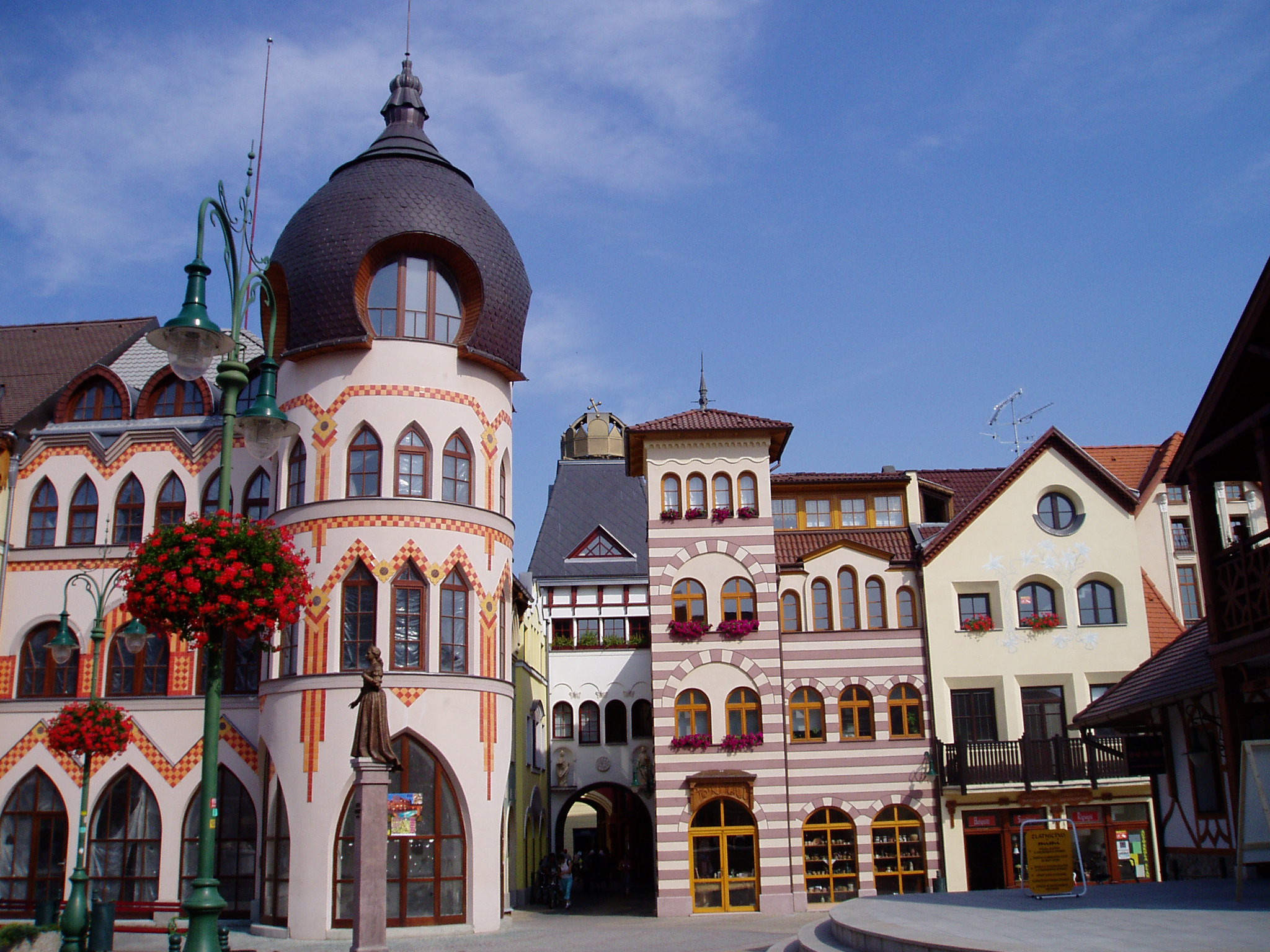 Nyilvános 1923 | 5237 | Komárom (Komárno), Európa udvar | A közelmúltban a Zichy–palota (lásd: Klapka tér 9.) udvarán építették ki az ún. Európa udvart. A helyi viszonylatban gigantikus méretű vállalkozás célja, hogy élőben mutassa be harmincöt európai ország építészetét. A városrész egyben Komárom új szolgáltató központja is, üzletekkel, éttermekkel, kávézókkal, valamint egy föld alatti bevásárlóközponttal. A fénykép 2005. júliusában készült. Felh.irod.: www.komarno.sk Mácza Mihály: Komárom nevezetességei. Pozsony, Madách-Posonium, 2002 |