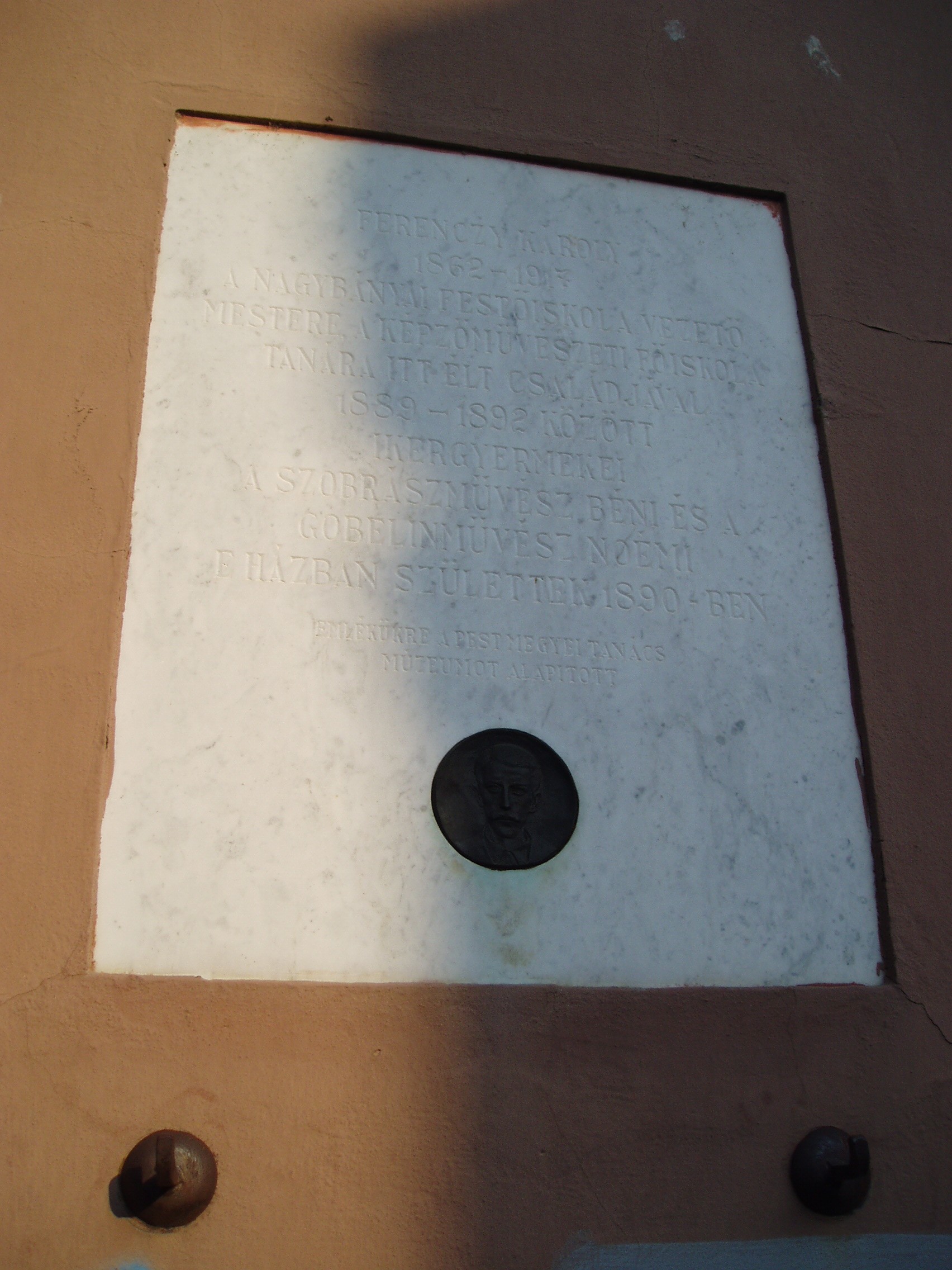 Nyilvános 1566 | 3341 | Szentendre, Alkotmány utca 1. | Ebben a házban élt 1889 és 1892 között Ferenczy Károly festőművész és felesége, Fialka Olga festőművész. 1890-ben itt születtek ikergyermekeik, akik mindketten halhatatlan alakjai a magyar képzőművészetnek: Ferenczy Béni szobrászművész és Ferenczy Noémi gobelinművész. A család legidősebb gyermeke, az 1885-ben született Ferenczy Valér is festőművész volt. A fénykép 2005 szeptemberében készült. |