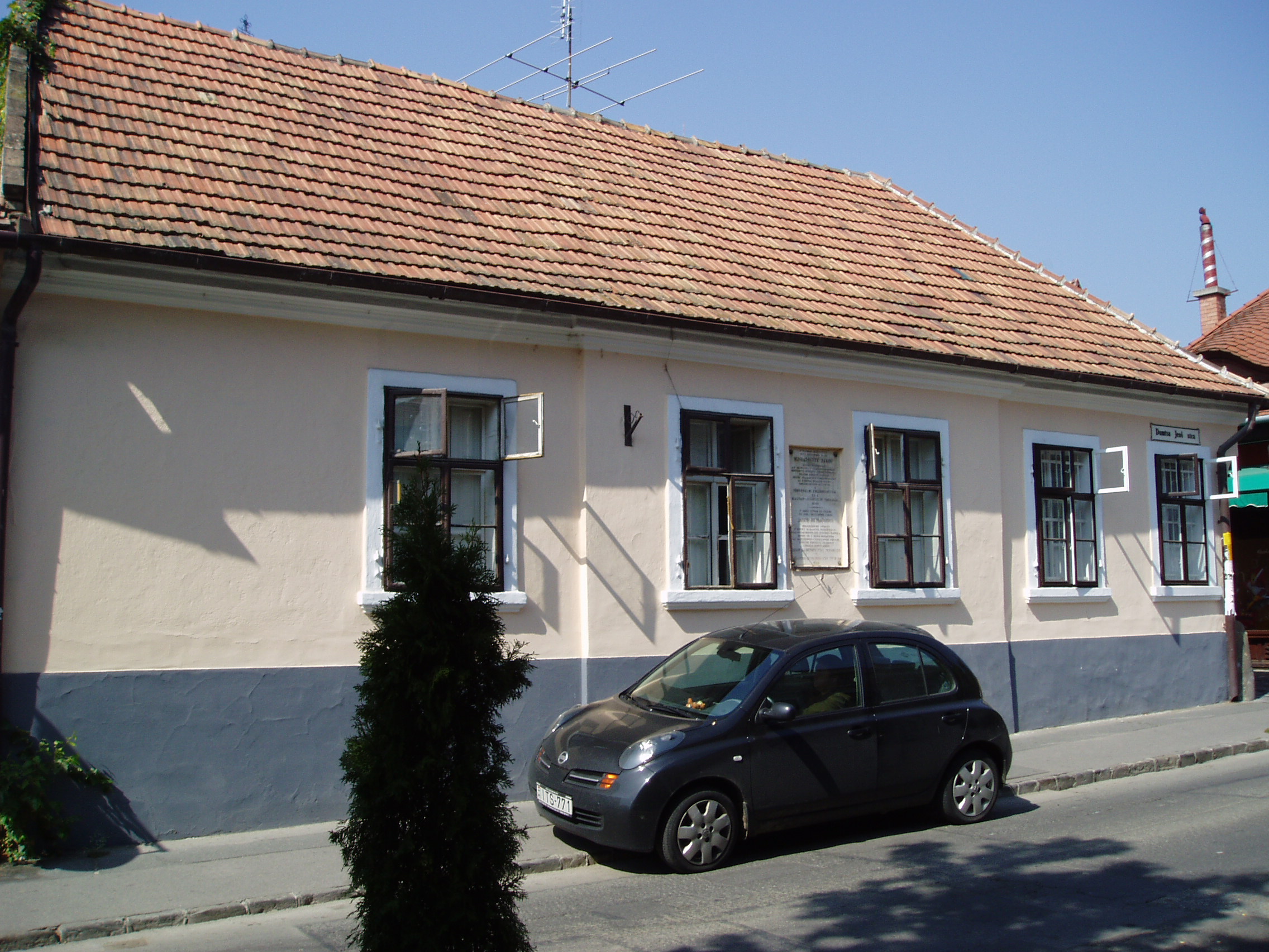 Nyilvános 1172 | 1831 | Szentendre, Dumtsa Jenő utca 5/A | Az utca 1897-ben kapta mai nevét a görög származású gazdag kereskedőről és földbirtokosról. 1871-től ő volt a város főbírója és 1872-től a rendezett tanácsú város első polgármestere. Az 5/A számú ház egyszerű, nyeregtetős barokk lakóház. Ebben a házban született 1822-ben Ignatovity Jakob (1822-1889), a szerb realista regényírás megteremtője. A fiatalember Pesten jogot hallgatott és 1848. március 15-én a Nemzeti Múzeum előtti népgyűlésen a közös forradalom szónoka volt. Társadalmi regényei közül az Örök vőlegény és a Respektus Vásza címűek kötődnek Szentendréhez. Bennük ábrázolja korának és városának szerb nemzetiségű társadalmát. A fénykép 2005 szeptemberében készült. Felh. irod.: Szentendre. Szerk. Sándyné Wolf Katalin. Bp. Panoráma, 1985 |