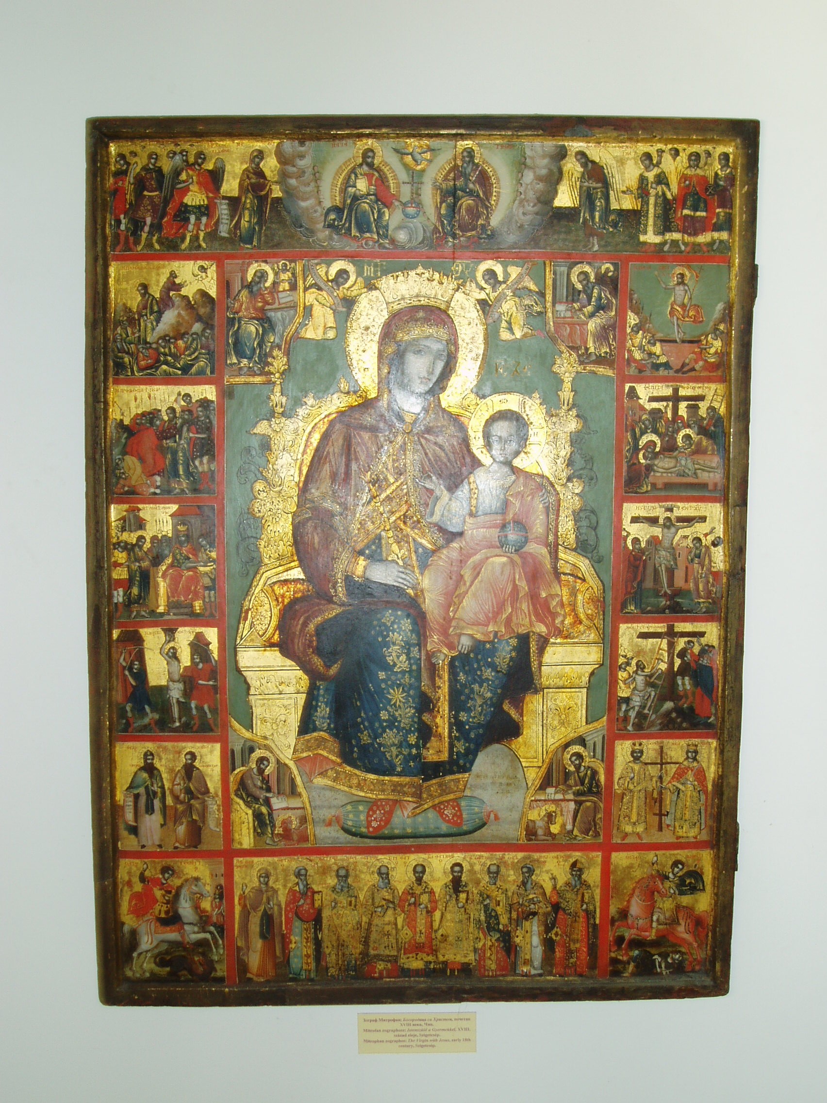 Nyilvános 1226 | 2545 | Szentendre, Pátriárka utca 5. Szerb Egyházművészeti Gyűjtemény | A Beográda-templom - a görögkeleti (ortodox) püspöki székesegyház - kertjében áll a püspöki palota és a szerb egyházművészeti múzeum épülete. Magyarország művészeti emlékeinek egyedülálló színfoltja a XVI.-XIX. századi szerb egyházművészeti emlékeket, ikonokat, ötvösmunkákat és más iparművészeti alkotásokat bemutató Szerb Egyházművészeti Gyűjtemény. A múzeum törzsanyaga a Budai Szerb Ortodox Püspökség kincstárából és a hazai szerb templomokból Szentendrére került kiemelkedő jelentőségű műtárgyakból alakult ki. A közelmúltban felújított épületbe került a Budai Szerb Püspökség könyvtára és levéltára is, mely szerb ősnyomtatványokat és egy török nyelvű kiváltságlevelet is tartalmaz. A képen a görög Mitrofan és társa: Isten anyja a gyermekkel és a szenvedéstörténet eseményeivel című, a XVIII. század elejéről származó ikonja látható, amely eredetileg a szigetcsépi templomé volt. A fénykép 2005 szeptemberében készült. Felh. irod.: www.szentendre.hu |