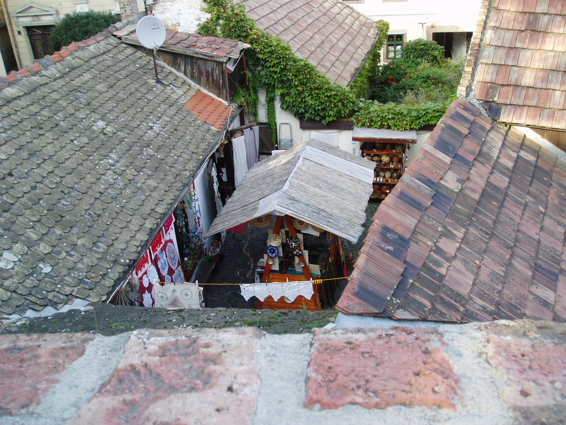 Nyilvános 1172 | 1873 | Szentendre, Várdomb | Szentendre egyik legszebb része a Várdomb, a település középkori központja. Tömör mellvéddel körülvett sétányáról megragadó látvány nyílik az oly sokszor megfestett szentendrei háztetőkre, a kis belső udvarokra, a belvárosra, a Dunára és a túloldali szigetre. A fénykép 2005 szeptemberében készült. Felh. irod.: Szentendre. Szerk. Sándyné Wolf Katalin. Bp. Panoráma, 1985 www.vendegvaro.hu www.szentendre.hu |