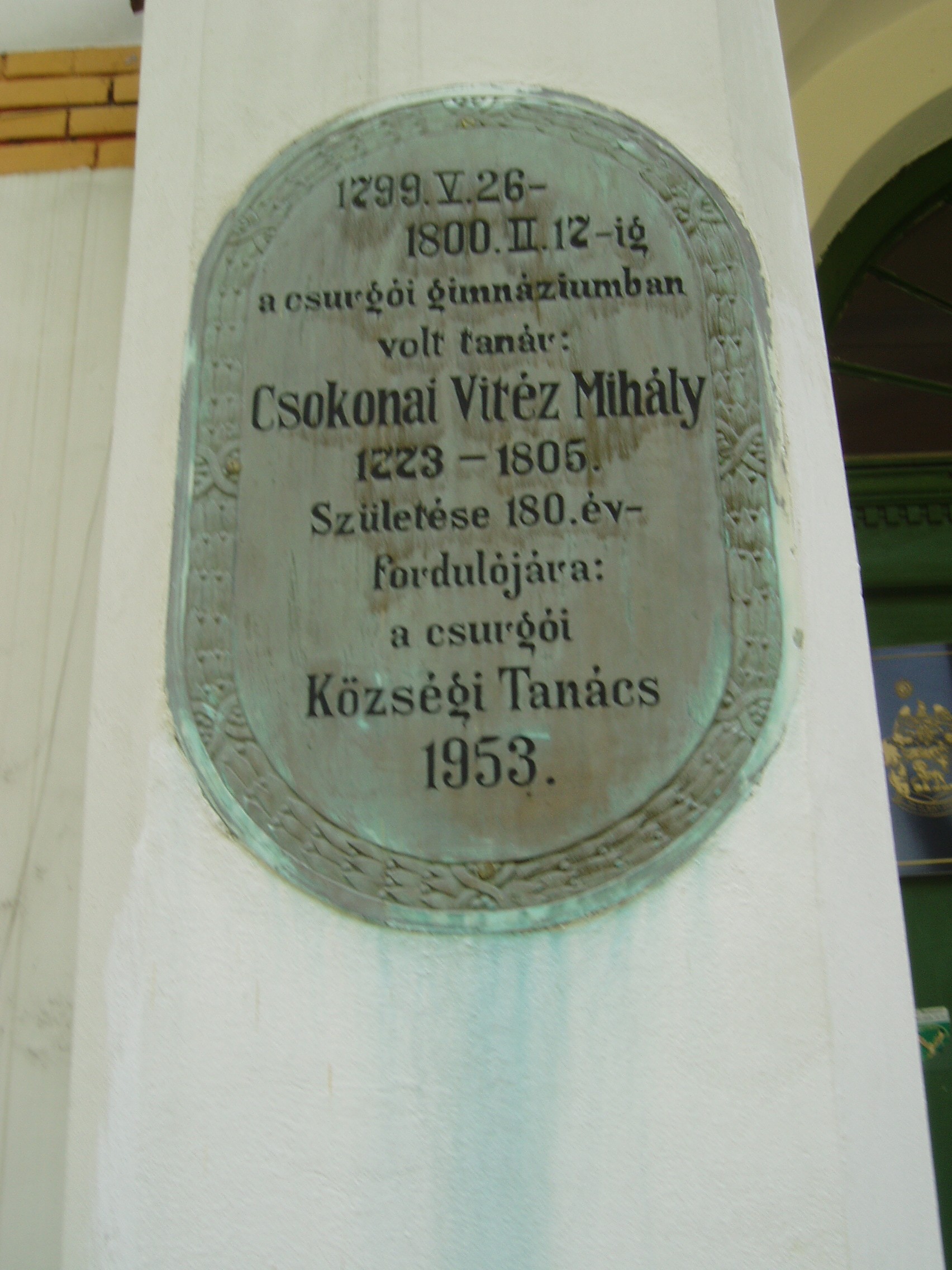 Nyilvános 1520 | 3877 | Csurgó, Széchenyi tér 9. Csokonai Vitéz Mihály Református Gimnázium és Általános Iskola | A XVIII. század végén alapított somogyi "első oskola" száz évvel később, 1897-ben költözhetett be új, mostani, akkor még csak egyemeletes otthonába. Az intézmény első, történelmi épületében (lásd: Csokonai u. 24.) ma a Városi Múzeum gyűjteménye tekinthető meg. A gimnázium mai épülete a régi iskola közelében, hatalmas parkban - az egykori vadasparkban - áll. Kapuja mellett 1953-ban állított emléktábla tudatja, hogy egykor az intézmény elődében tanított Csokonai Vitéz Mihály. A nagy szárnyas ajtón az iskola aulájába lépve két szép, vörös márványba foglalt bronz dombormű fogadja a látogatót: Festetics György, az iskolaalapító gróf és az intézmény halhatatlan segédtanára, Csokonai Vitéz Mihály. Az 1931-ben felavatott domborművek alkotója Horvay József szobrászművész. Az Alapító és a Költő domborművén kívül az egykori neves tanárok arcképcsarnoka is a hagyományok tiszteletére figyelmezteti a diákokat, látogatókat. Méltán híres az iskola muzeális könyvtára is. A fénykép 2004 októberében készült. Felh. irod.: Horváth József: Csurgó. Műemlékek. Bp. Tájak, Korok, Múzeumok Kiskönyvtára 441. 1982 Csurgói kalauz. Szerk. Terényi Zoltán. 1974 Látnivalók Somogy megyében. Miskolc, Well-PRess Kiadó, 2000 www.vendegvaro.hu |