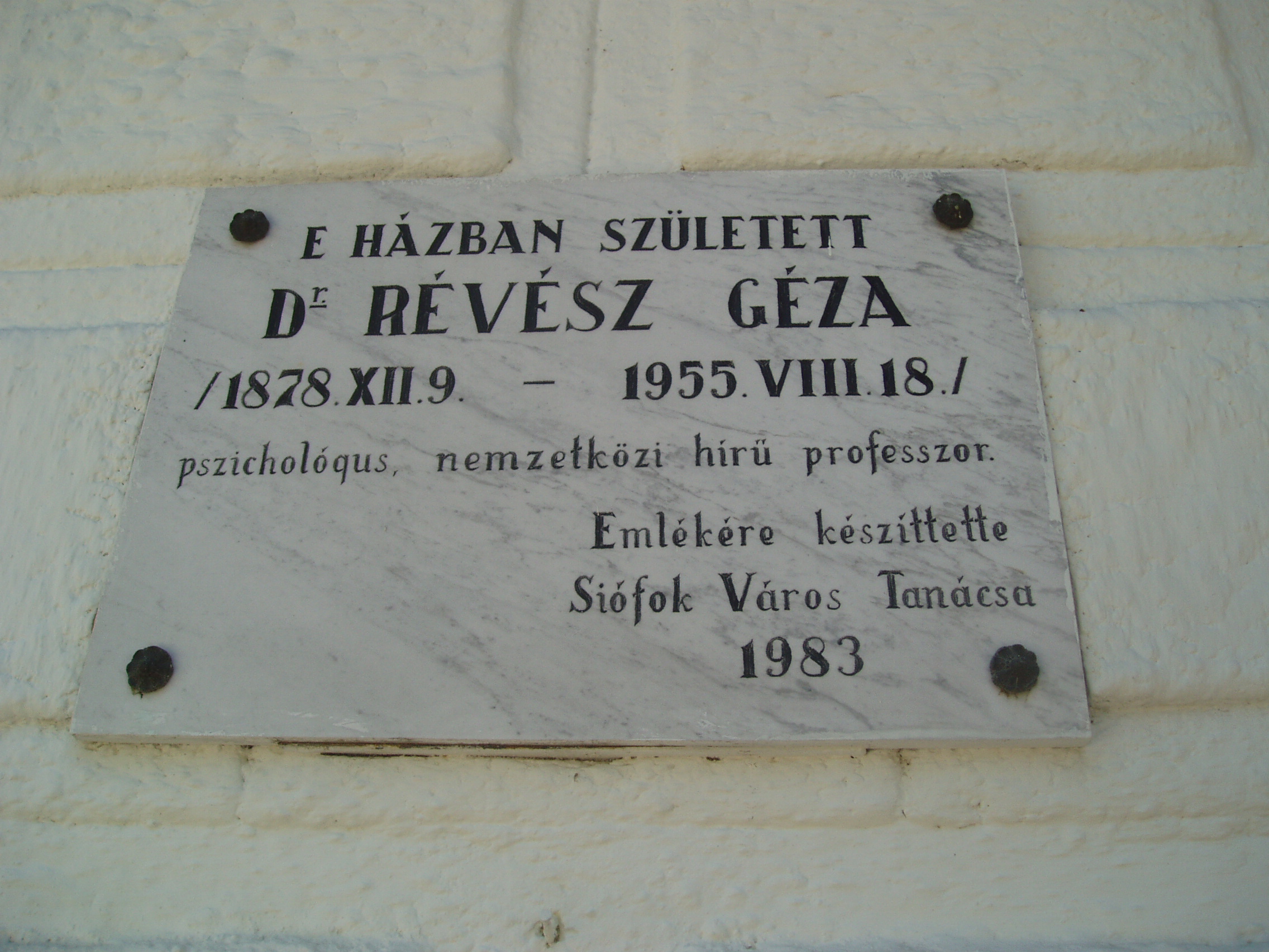 Nyilvános 1185 | 2060 | Siófok, Bajcsy-Zsilinszky utca 48. | 1878. december 9-én ebben a házban született Révész Géza pszichológus, nemzetközi hírű professzor. Elsősorban zenepszichológiával és hangfiziológiával foglalkozott. 1919-ben emigrált. 1921-től Amszterdamban működött, mint az ottani kísérleti lélektani intézet igazgatója. 1932-1950 között az amszterdami egyetemen a lélektan tanára volt. 1949-től a bajor tudományos akadémia tagja. A würzburgi egyetem díszdoktorává avatta. Amszterdamban hunyt el 1955. augusztus 18-án. A fénykép 2006 júliusában készült. Felh. irod.: Magyar életrajzi lexikon |