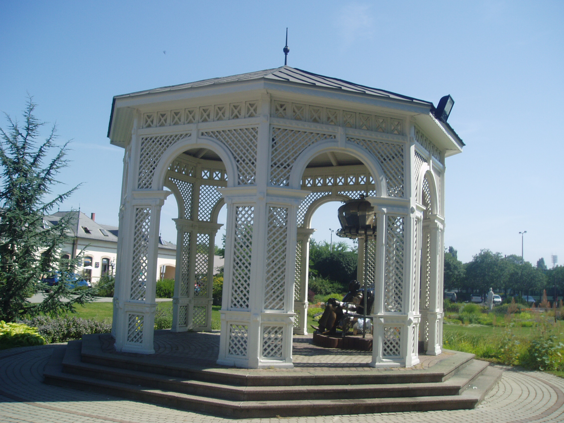 Nyilvános 1238 | 2618 | Siófok, Millennium park. Varga Imre: Kálmán Imre | Az 1920-ban épült, hajdani pompájában felújított állomásépület előtt 1994-ben készült el a 16 ezer négyzetméteres Millennium park. Gyönyörű pázsit, különleges cserjék, virágok, szobrok, tavacska, este díszkivilágítás ékesíti a területet. Itt állították fel - stílszerű környezetben, egy zenepavilonban - a város nagy szülötte (lásd: Siófok, Kálmán Imre sétány 5.), Kálmán Imre szobrát, mely karosszékben ülve, enteriőr–szerű környezetben ábrázolja a világhírű operettszerzőt. Az 1997-ben felavatott szobrot Varga Imre készítette, aki maga is siófoki születésű és számos alkotása tekinthető meg a városban (lásd: Siófok, Fő tér). Az ő alkotása a Művészeti iskola előtt álló Bartók–szobor is (lásd: Siófok, Mártirok útja 5.). A fénykép 2006 júliusában készült. http://www.siofok.hu/seta_a_varosban_hu.php |