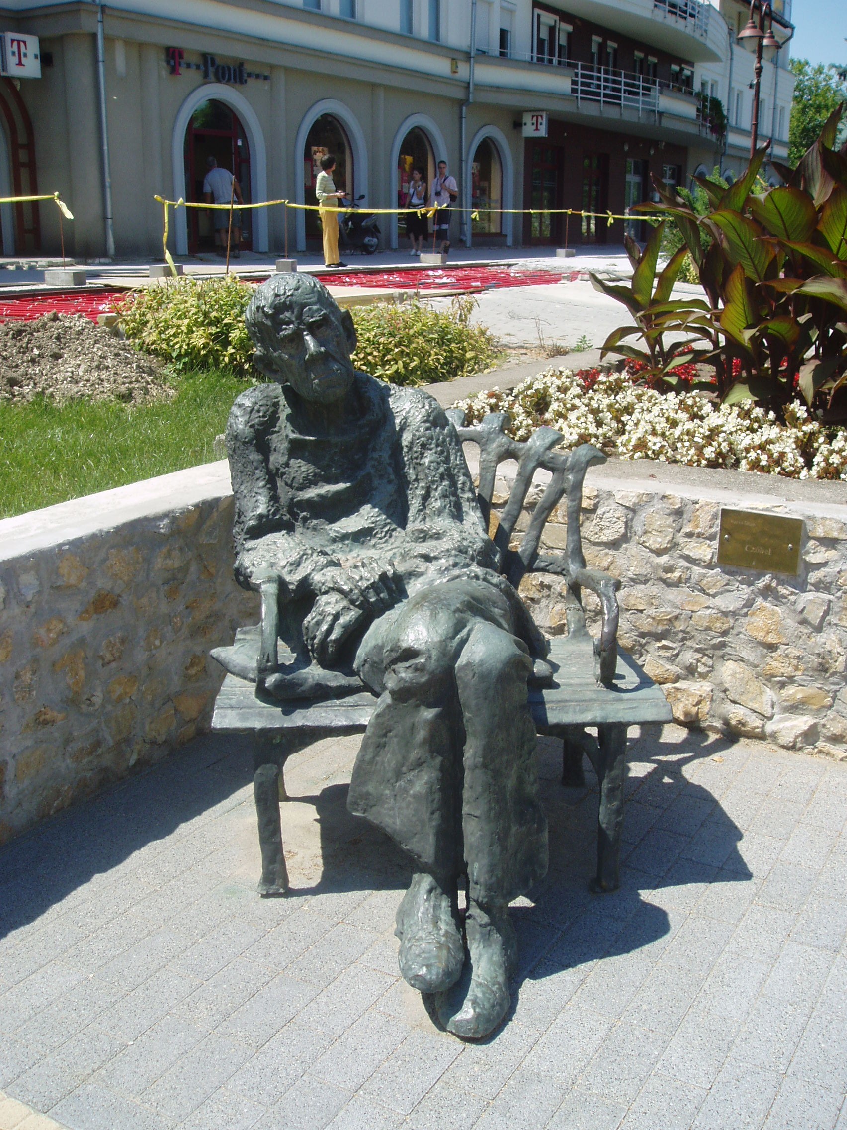Nyilvános 1210 | 2701 | Siófok, Fő tér: Varga Imre: Czóbel Béla | Varga Imre szobrászművész 1923. november 1-jén született Siófokon. Már gyermekkorában - a siófoki elemi iskolában - rendkívül jó rajzkészségével tűnt ki. 13 évesen szerepelt egy képével Párizsban. A képzőművészet terén elért kimagasló érdemeiért, amellyel Magyarország és Siófok város hírnevét is öregbítette, 1985-ben ő lett Siófok város első díszpolgára. Hazai és külföldi tereken, templomokban, középületekben mintegy 300 alkotását helyezték el. Szobrai állnak Belgiumban, Franciaországban, Lengyelországban, Németországban, Norvégiában és Izraelben. Siófokon a Fő téren szabadtéri szoborkiállítása látható. Czóbel Béla festőművészről készített egészalakos szobrának első példányát Szentendrén, a Czóbel Múzeum (lásd: Pest megye/Szentendre, Templom tér 1.) előtt helyezték el. A fénykép 2006 júliusában készült. Felh. irod.: http://www.siofok.com/uj/object/varga-hu.html |