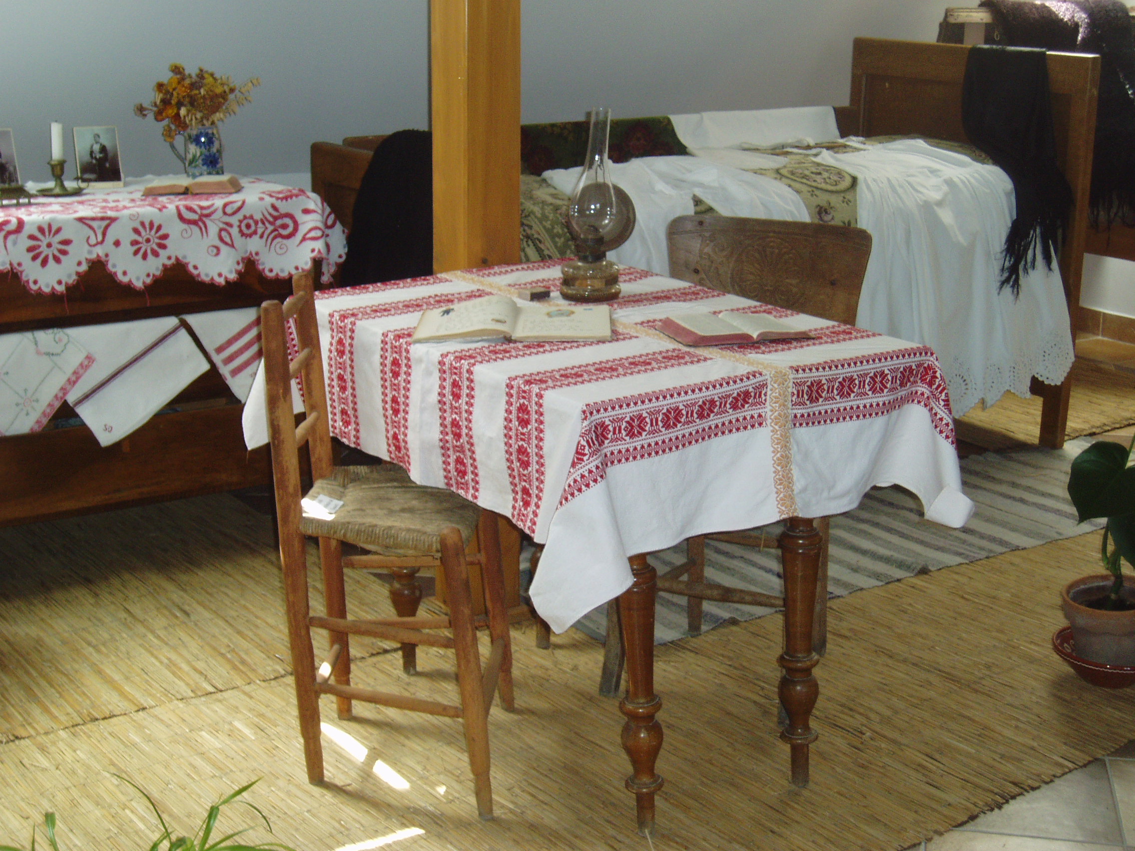 Nyilvános 1176 | 1923 | Fonyód, Bartók Béla utca 3. Természetvédelmi és Helytörténeti Múzeum | A fonyódi Várhegyen kialakult Bélatelephez tartozó, a Balaton egyik legszebb panorámájú helyén álló villát az orvosi doktorátussal rendelkező, többek között Kelet-kutatóként is számon tartott lászlófalvi Velics Antal (1875-1915) építtette az 1900-as évek elején. Ebben a villában töltötte 1916 és 1917 nyarát Szinyei Merse Pál, hazánk egyik legkiválóbb festőművésze. Balatoni tartózkodása idején hozzávetőleg tíz fetményt alkotott. Az épület az 1980-as évek végéig moziként üzemelt. Felújítása után, 2004-ben nyílt meg termeiben a fonyódi Természetvédelmi és Helytörténeti Múzeum. Benne a Fonyód történetét és néprajzát bemutató állandó kiállítás mellett időszaki kiállításokat is rendeznek. A képen a néprajzi kiállításrész látható. A fénykép 2007 júliusában készült. Felh. irod.: http://muzeum.fonyod.hu/ |